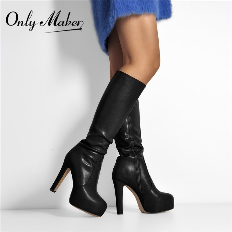 Onlymaker Women Knee High Boots Round Toe Black Matte Leopard White Side Zipper Winter Fashion Party Dress Big Size Boots