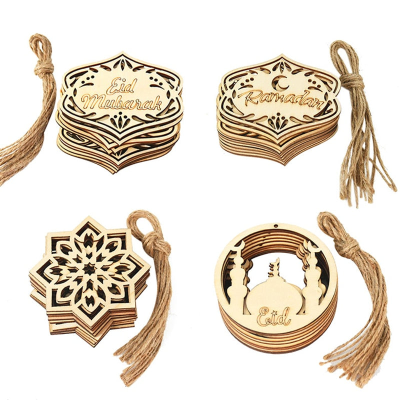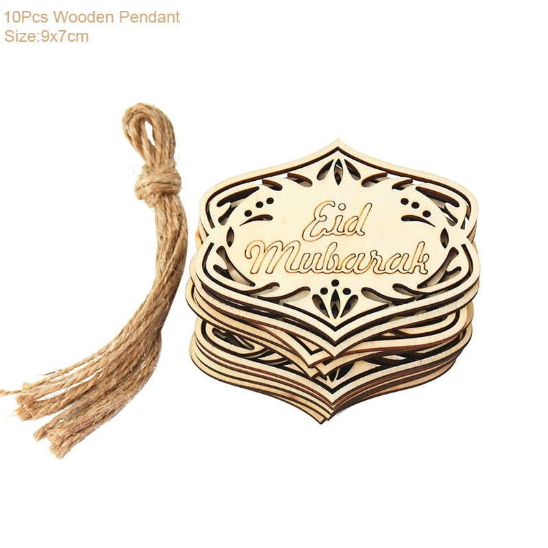 10pcs Wooden Eid Mubarak Pendants Ramadan Ornament DIY Islamic Muslim Festival Party Decoration for Home Moon Eid Al-Fitr Decor
