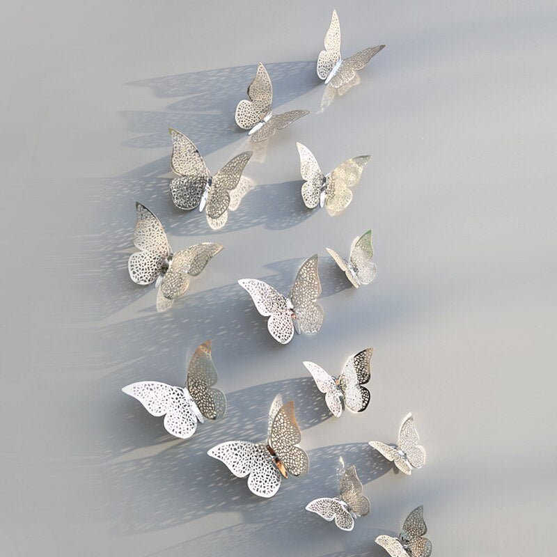 12 Pcs/Set 3D Wall Stickers Butterfly Hollow Paper 3Sizes Silver Gold for Fridge Stickers Home Party Wedding Decor Free Shipping