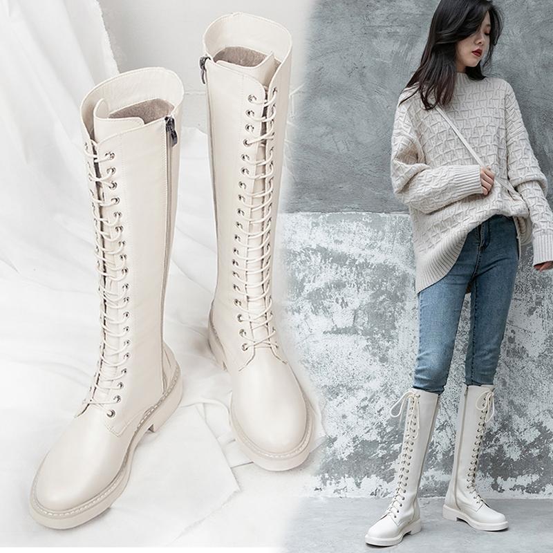 2020 Fashion INS High Boots Woman Knights Knee Boots Thicken Plush Women Winter Shoes British Style Block Heel Lace-up Footware