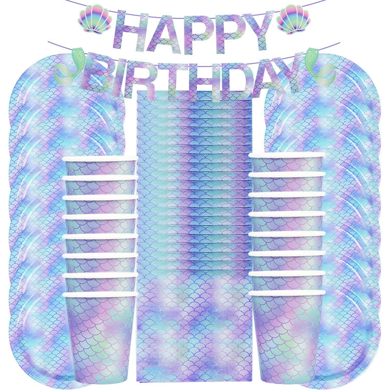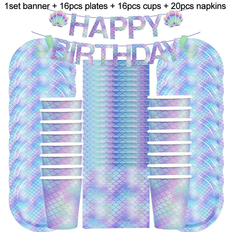53Pcs Mermaid Party Disposable Tableware Set Paper Cups Plate Napkin Little Mermaid Birthday Party Banner Baby Shower Decoration