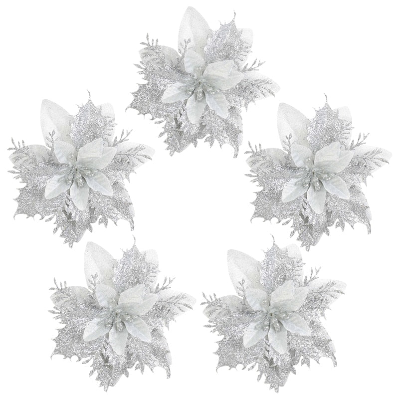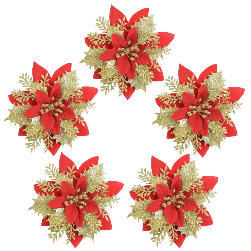 5pcs Glitter Artificial Christmas Flowers Xmas Tree Decorations Ornaments Merry Christmas Decorations for Home New Year Gift