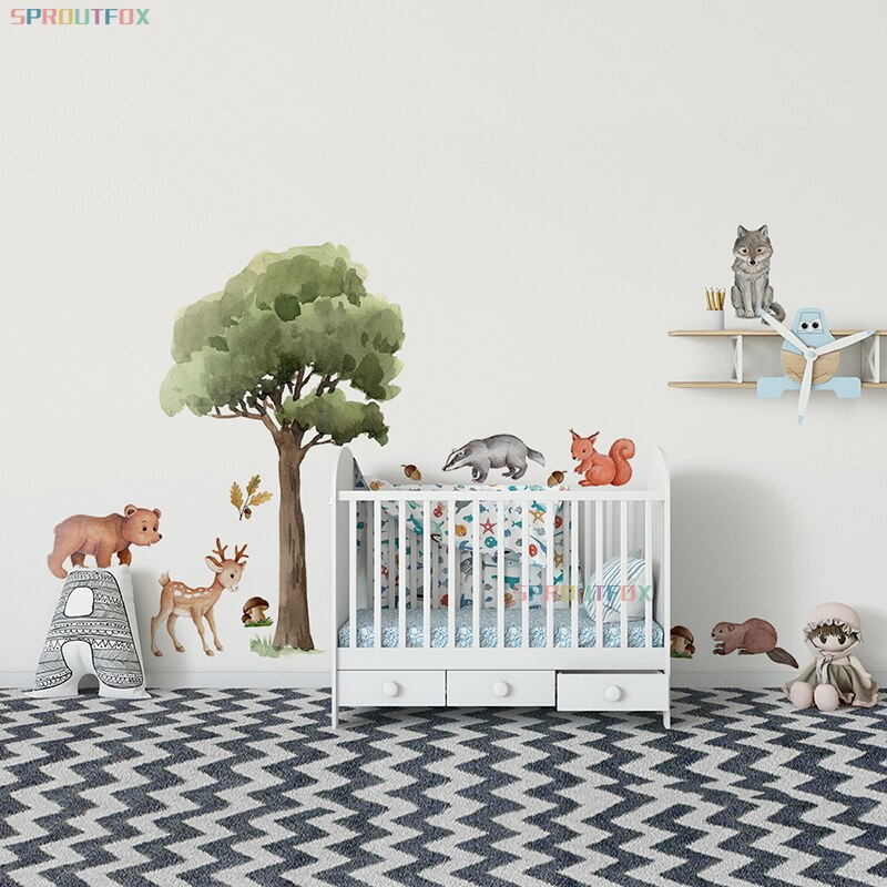 Big Green Tree Wall Sticker Forest Animals Decals Squirrel Bear Deer for Baby Room Nursery Home Decoration Cute Animal Mural PVC