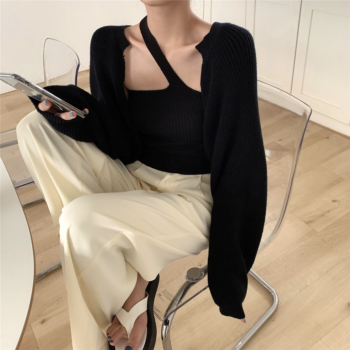 Cardigan Women Open Stitch Short Knitted Solid Lantern Sleeve Vintage Retro Korean Style Chic Streetwear Simple All-match Casual