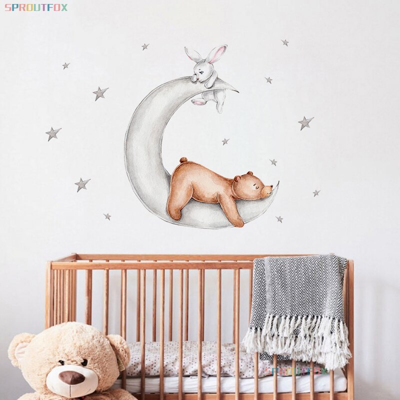 Cartoon Animal Bunny Bear Wall Sticker For Kids Room Baby Girl Room Sleeping on the Moon Stickers Nursery Bedroom Kids Stickers