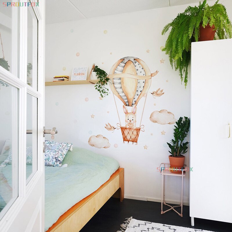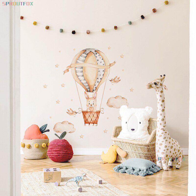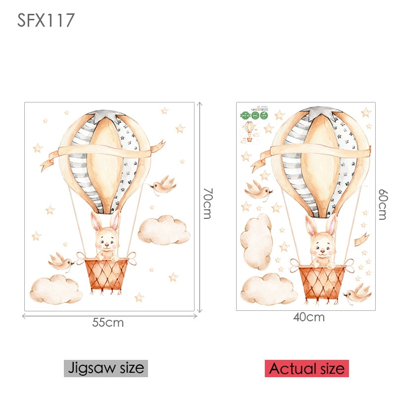 Cartoon Baby Cute Bunny Wall Stickers Hot Air Balloon Wall Decals Baby Nursery Home Decoration Clouds and Stars for Girls Room