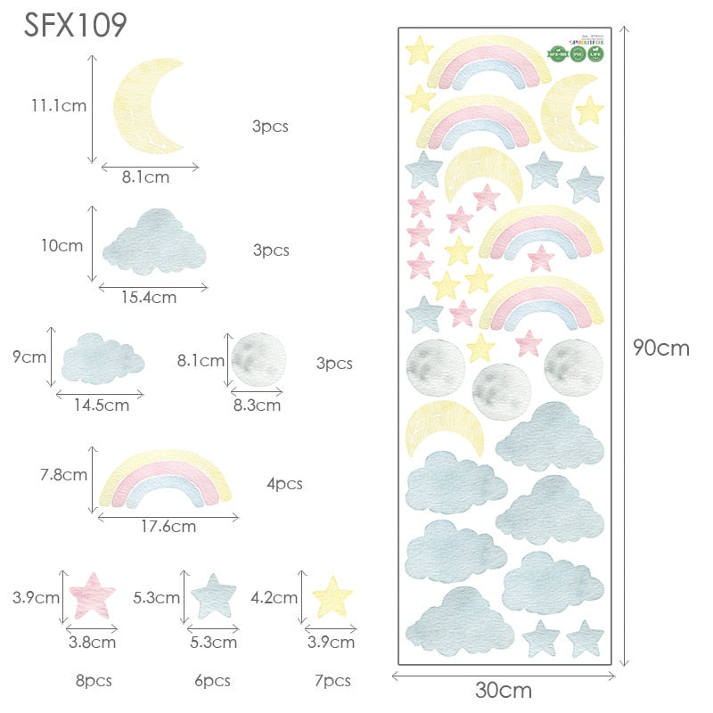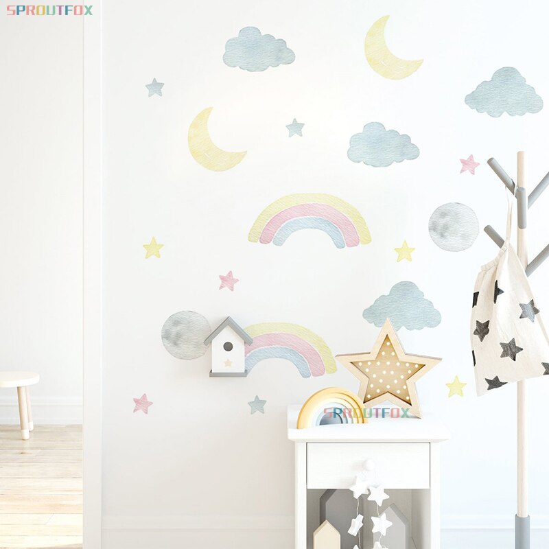 Colorful Rainbow Cartoon Moon Clouds Stars Wall Stickers for Baby Room Kids Room Modern Decoration Vinyl Nursery Decals
