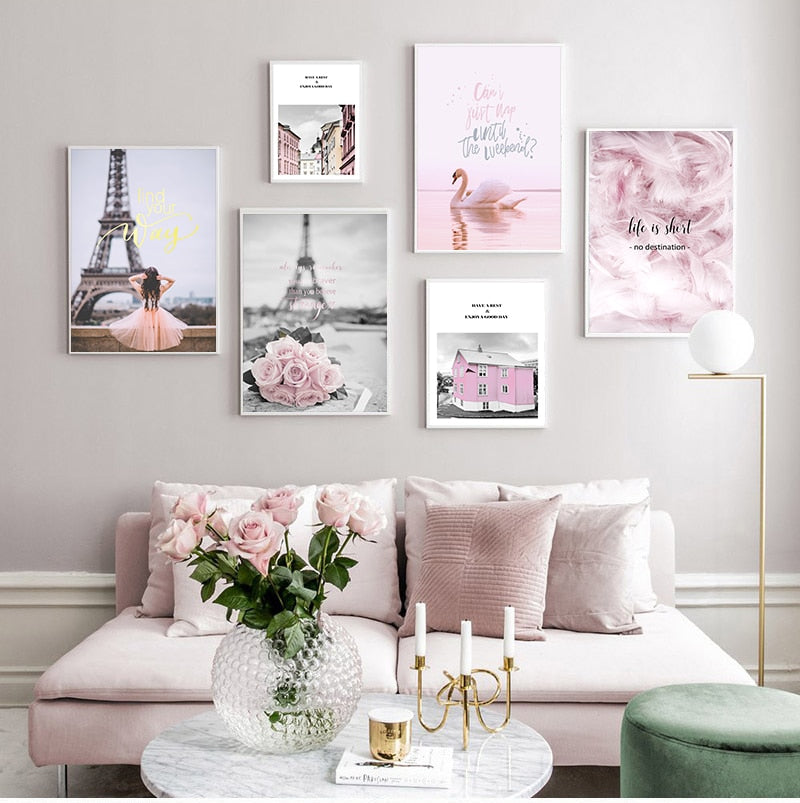 Eiffel Tower Girl Wall Art Canvas Fashion Pink City Landscape Print Painting Nordic Decoration Picture Living Room Decor