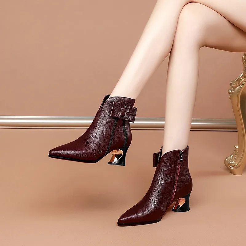 FHANCHU Soft Leather Women Ankle Boots,Bowtie Winter Shoes,Short Botas,Pointed toe,Strange Heel,Brown,Black,Wine-red,Dropship