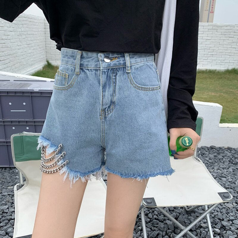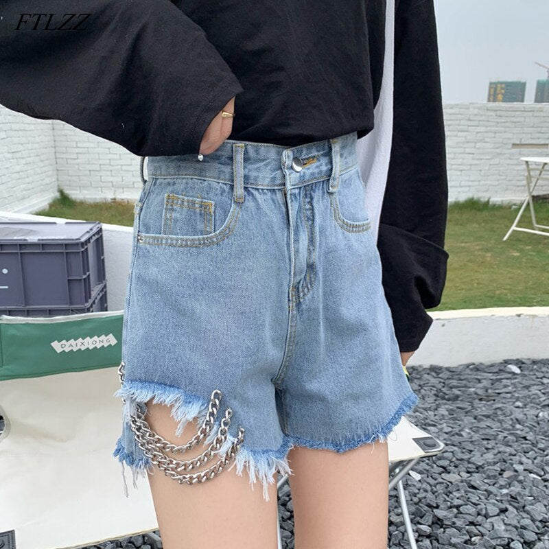 FTLZZ New Summer Women High Waist Chains Blue Denim Shorts Streetwear Female Loose Asymmetrical Tassel Ladies Jeans Shorts