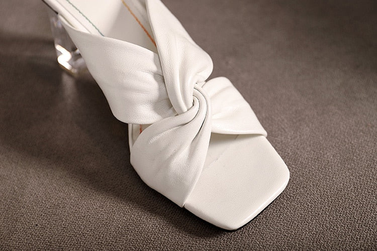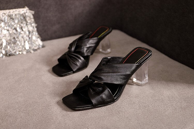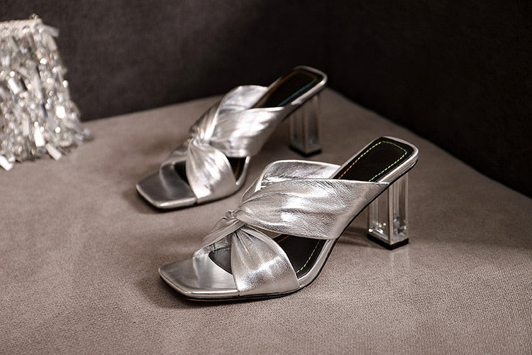 Gold Metallic Leather Knot Sandals Chunky High Heel Open Toe Mule Sandals 9CM Designer Shoes Summer Woman Size 41 Block Heel