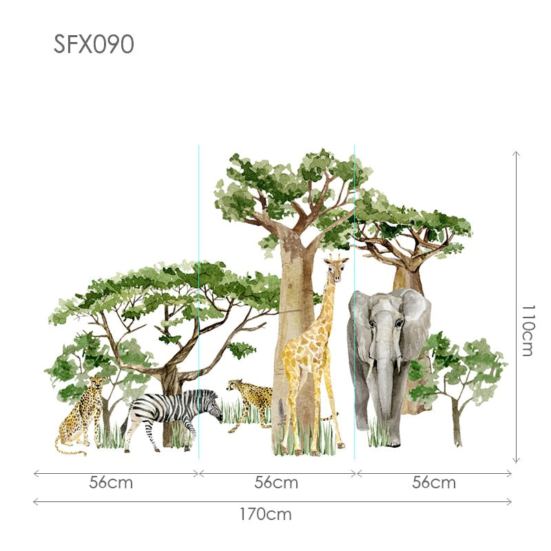 Large Animal Elephant Giraffe Zebra Leopard Wall Stickers for Kid Rooms Baby Boys Bedroom Big Tree Green Forest Animals Decal