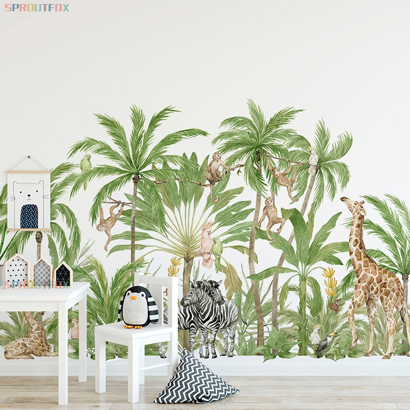 Large Animal Giraffe Zebra Monkey Wall Stickers for Kids Rooms Forest Animal Palm Tree Home Decals Nursery Wallpaper Decoration