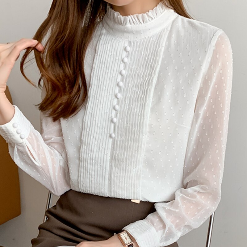 Loose White Elegant Blouse Autumn Pleated Ruffle Blouse Women Top Long Sleeve Lace Chiffon Shirt Office Lady Blusas Mujer 16776