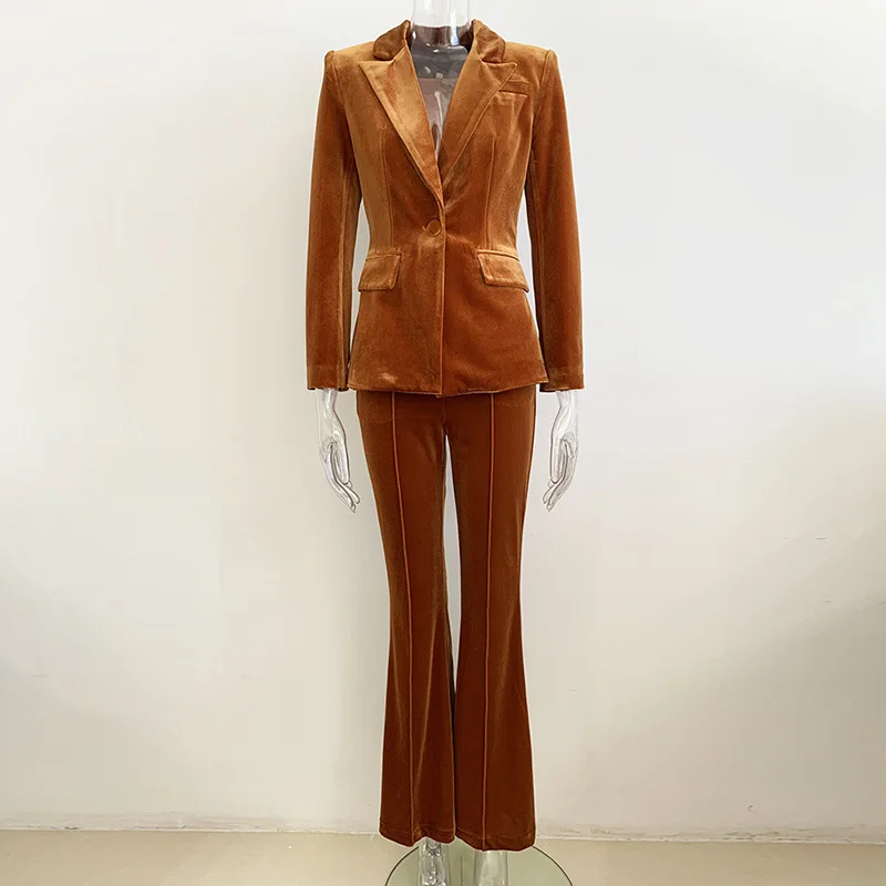 Nigikala Nigikala And Winter 2025 New Women's Professional Fashion A Buckle Gold Velvet Suit Jacket + Horn Pants Set Two Sets