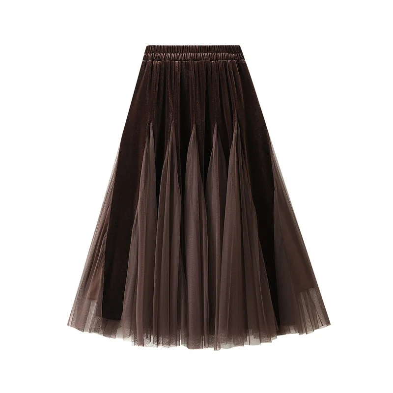 Nigikala Nigikala Autumn And Winter Gold Velvet Splicing Mesh Dress Half-Dress Woman's Long High-Rise Thin Yarn Dress D8810