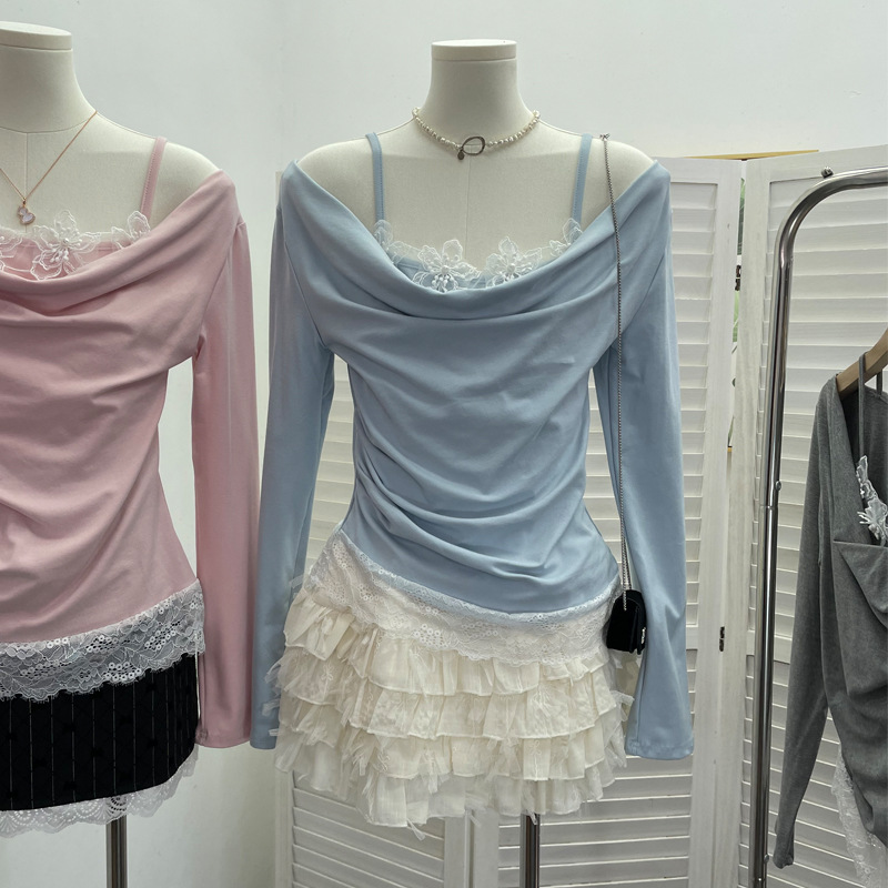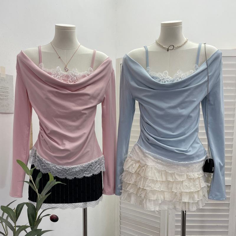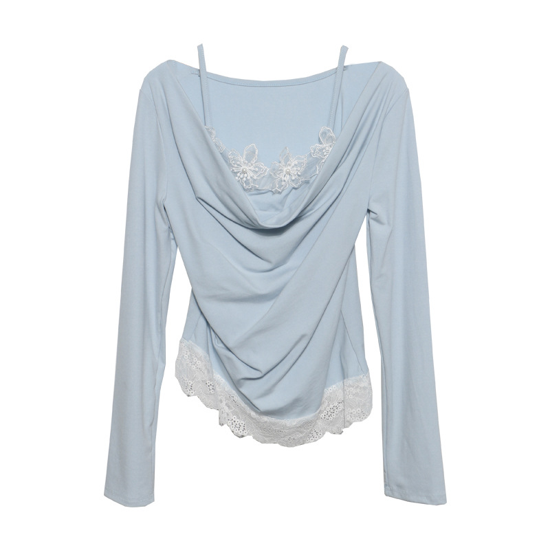 Nigikala Nigikala Autumn Fake Two Lace Lace Collar Folding Long Sleeves Slimming Bottom T-Shirt Top Woman 2532
