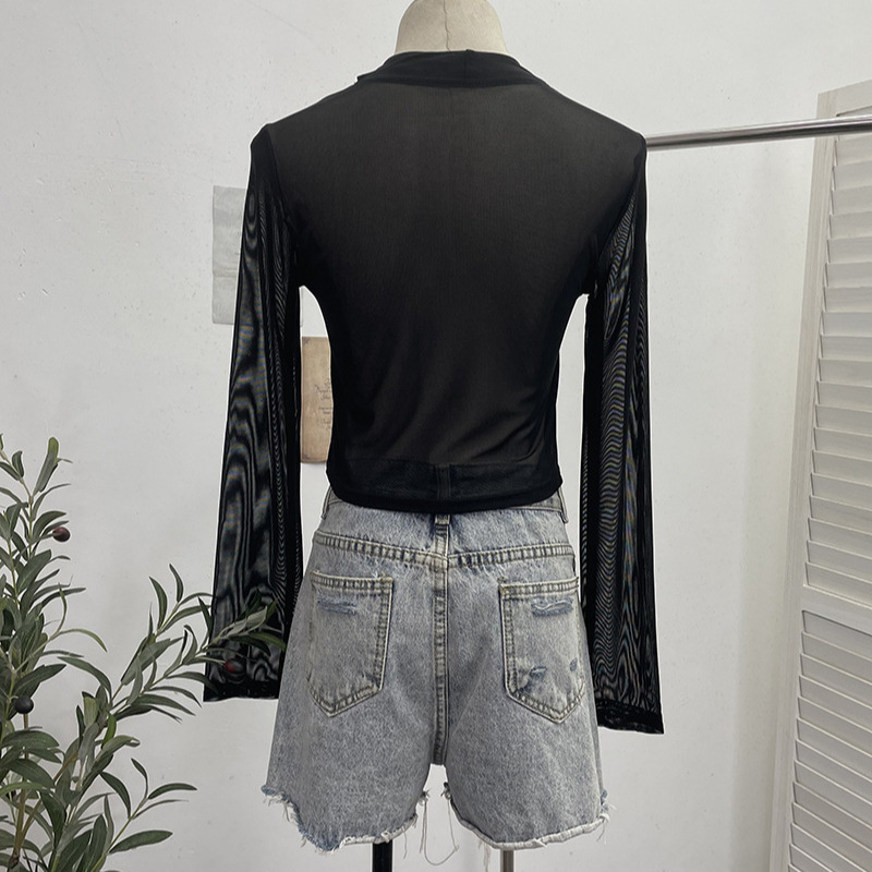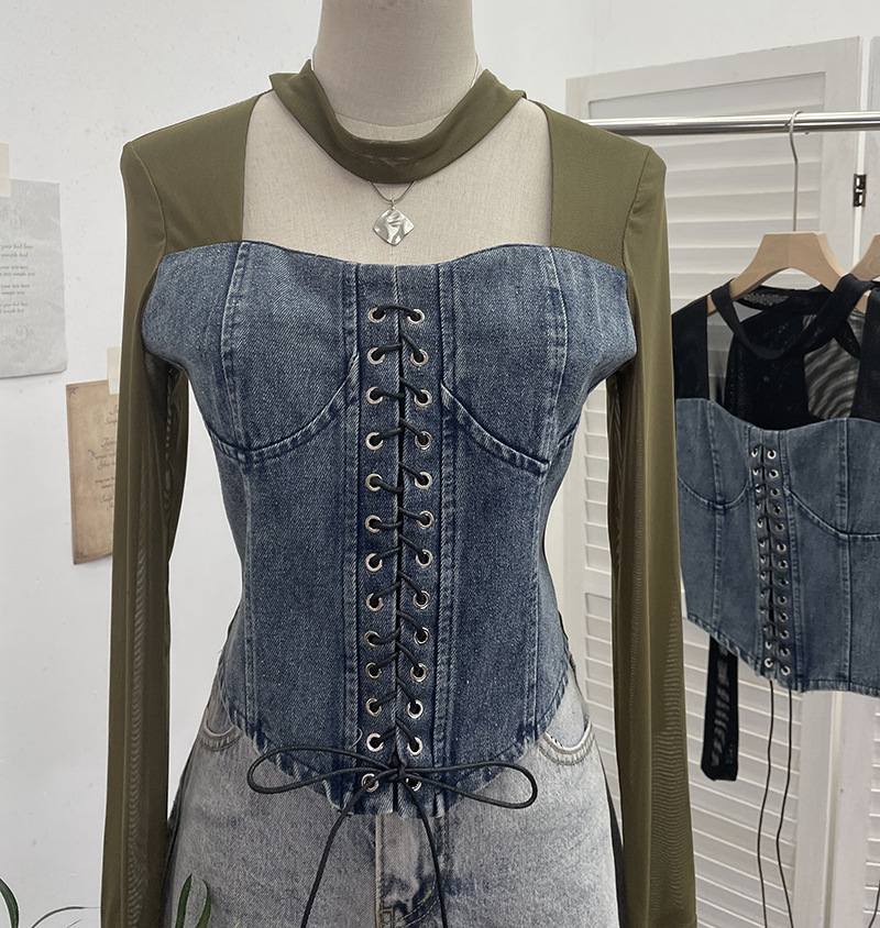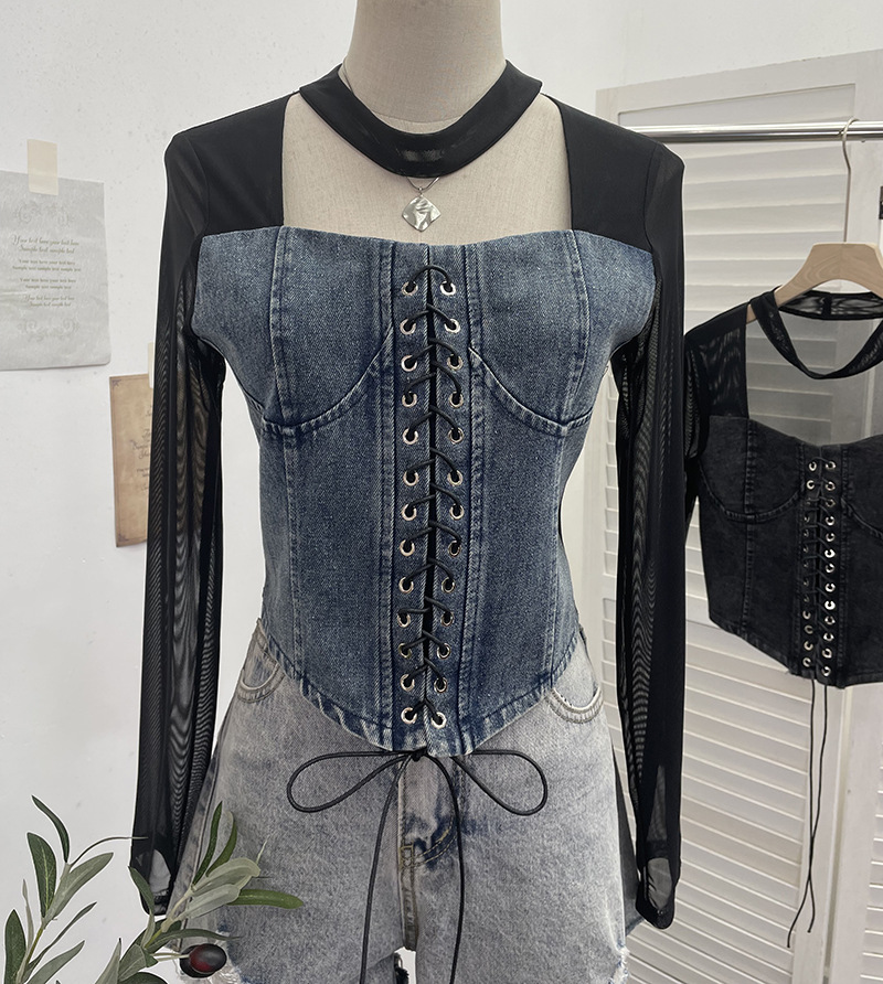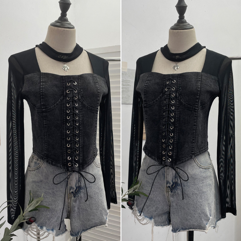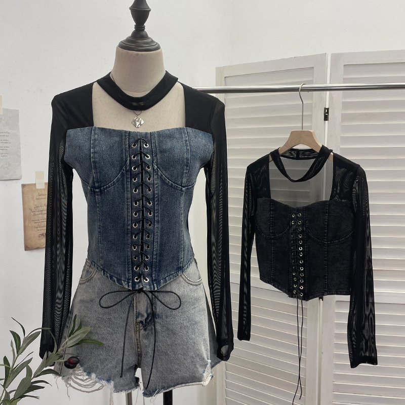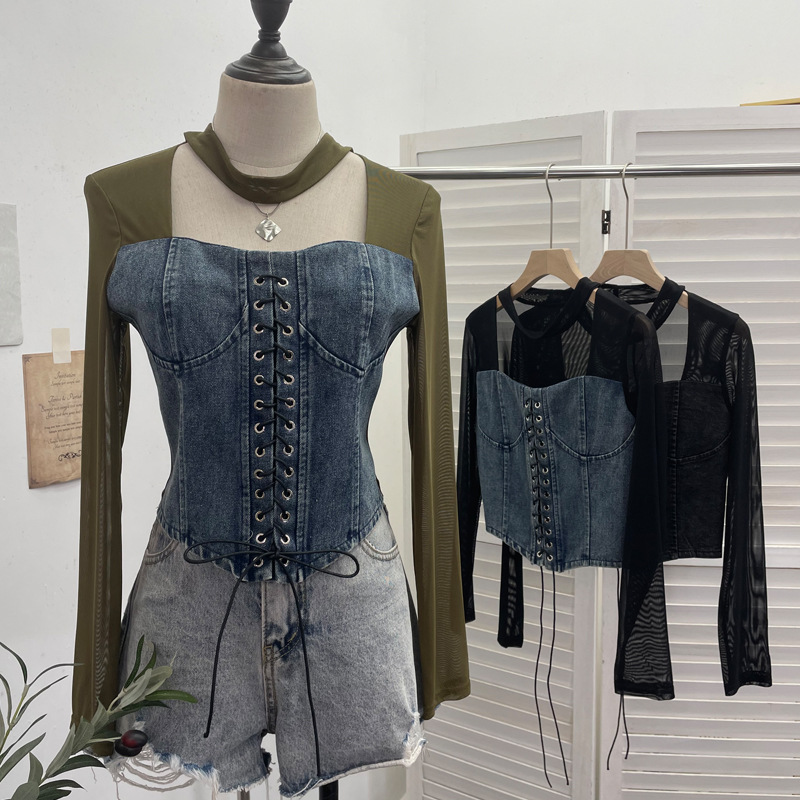 Nigikala Nigikala Hollow Hanging Neck Cowboy Splicing Mesh Strap With Irregular Long-Sleeved T-Shirt Short Top 88882