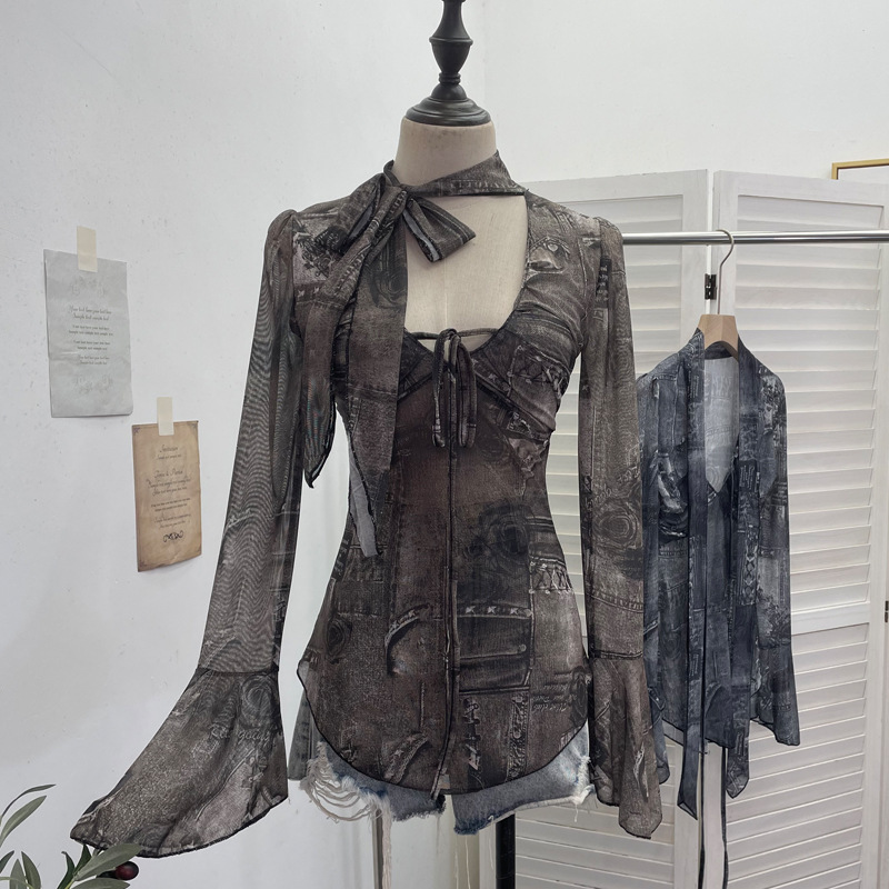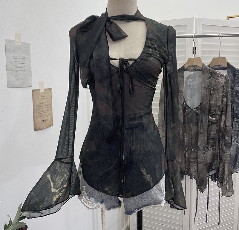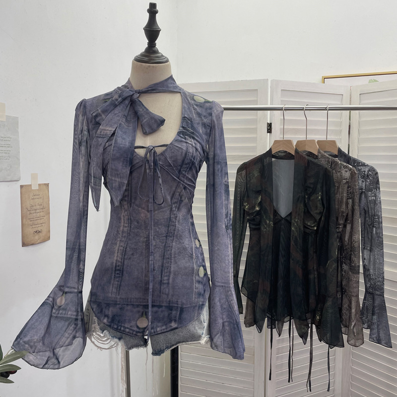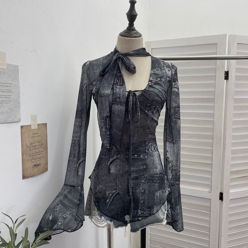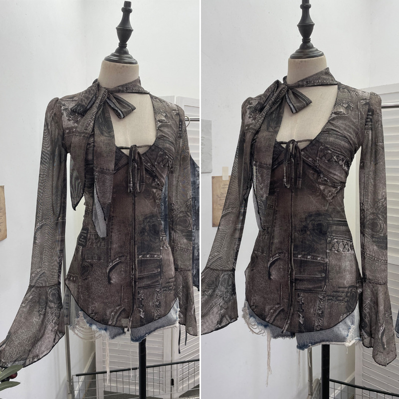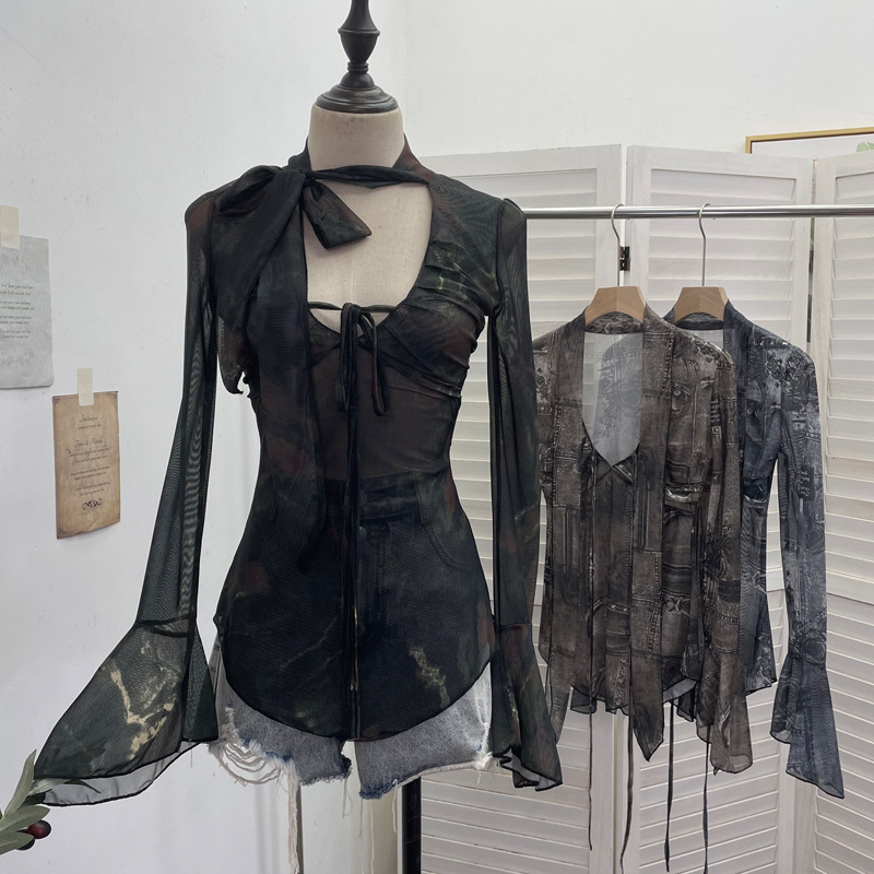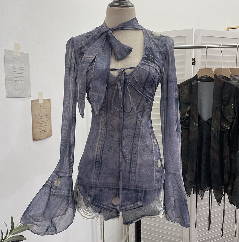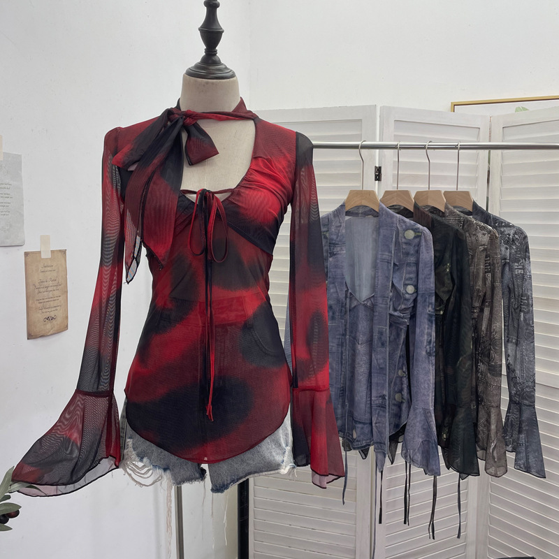 Nigikala Nigikala Hollow Tying With Low-Necked Bow Ribbon Dizzy Red Elastic Mesh T-Shirt Top 8036