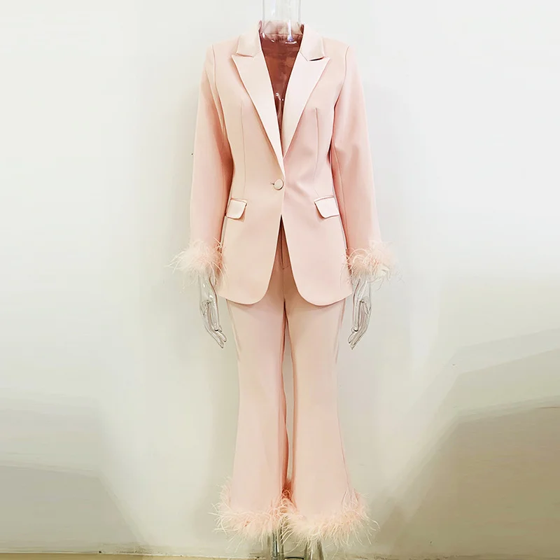 Nigikala Nigikala New Fashion Temperament Real Feather Ostrich Hairy Blazer Nine-Point Trouser Suit Two Sets