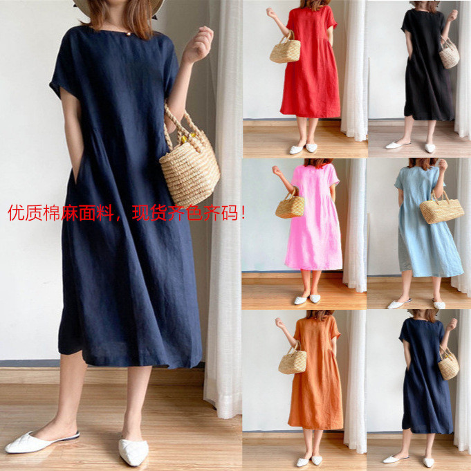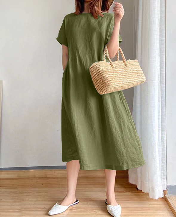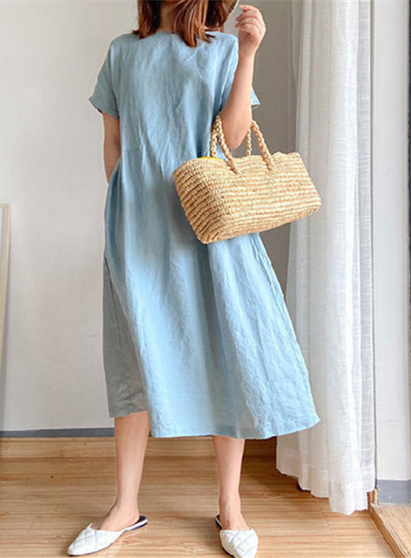 Nigikala Nigikala New Leisure Spring And Summer Loose Skirt Short Sleeve Round Neck Solid Cotton Linen Dress