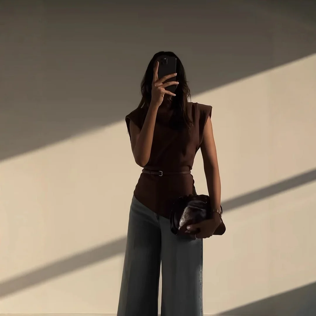 Nigikala Nigikala New Women's Fashion Asymmetric Folding Decoration Shoulderless Sleeveless Top 0085845