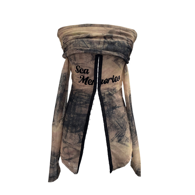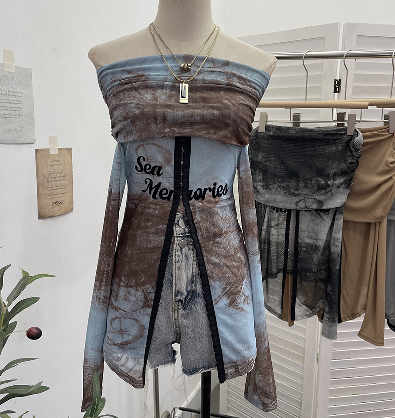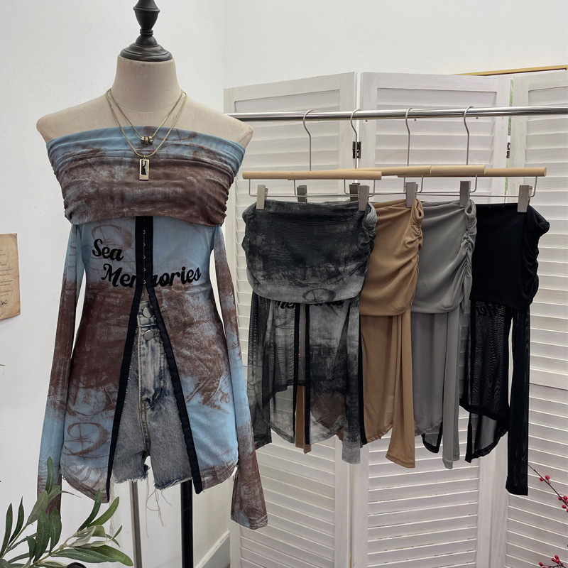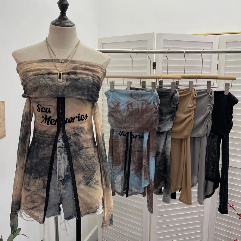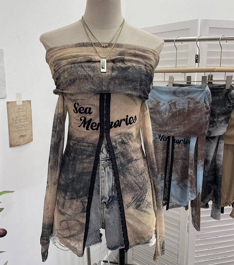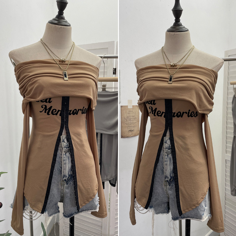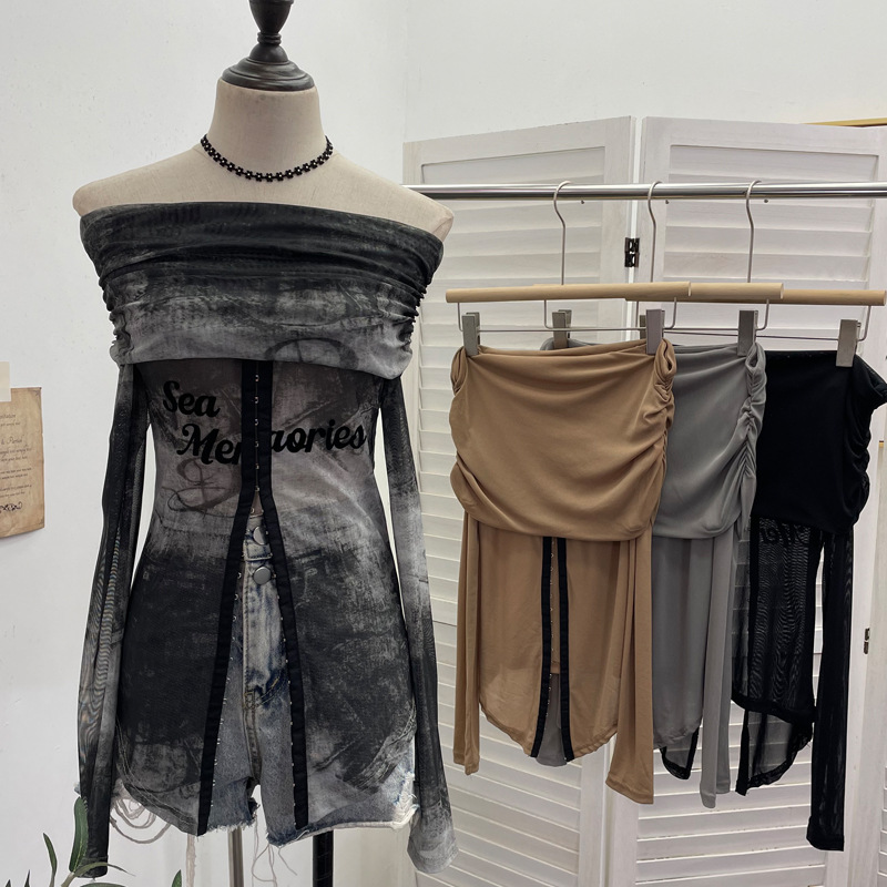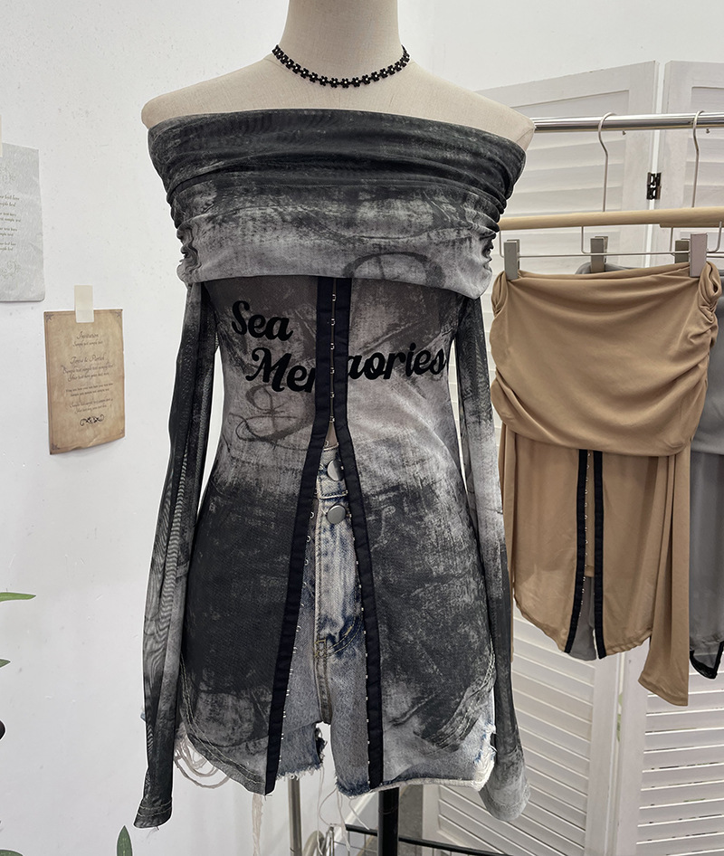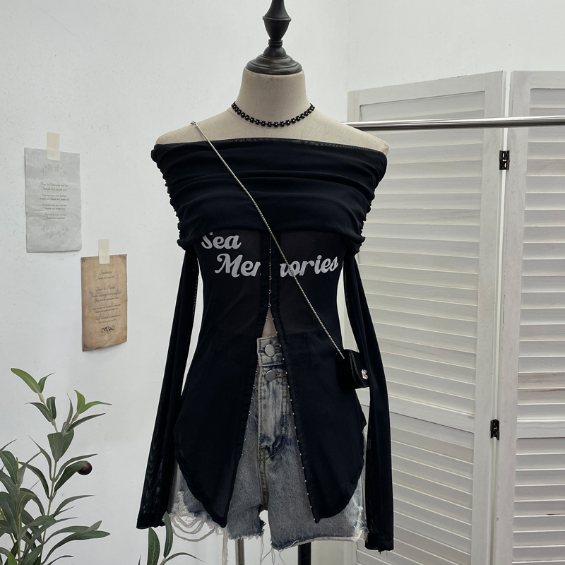 Nigikala Nigikala Picts Single-Layer Mesh Yarn Micro-Sleeved T-Shirt Word Shoulder-Pollid Letter Open Fork Top 1180