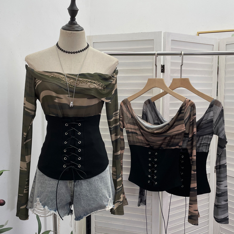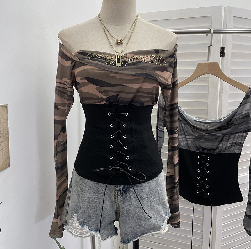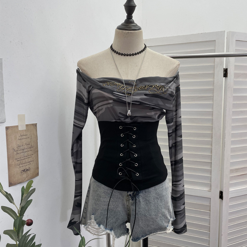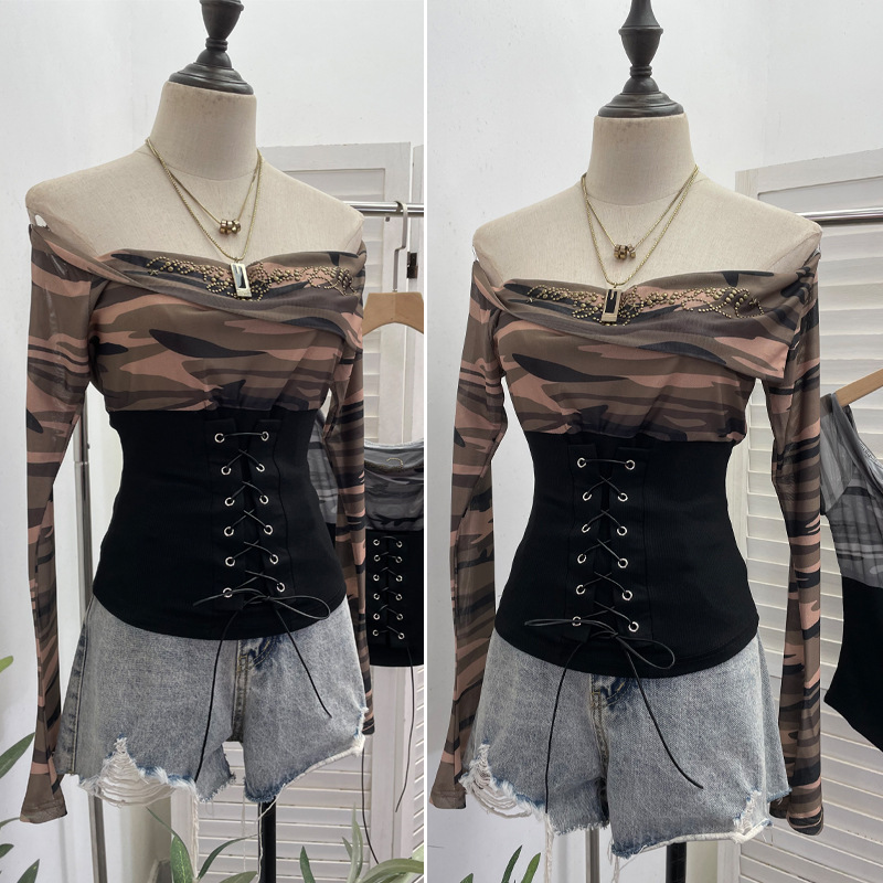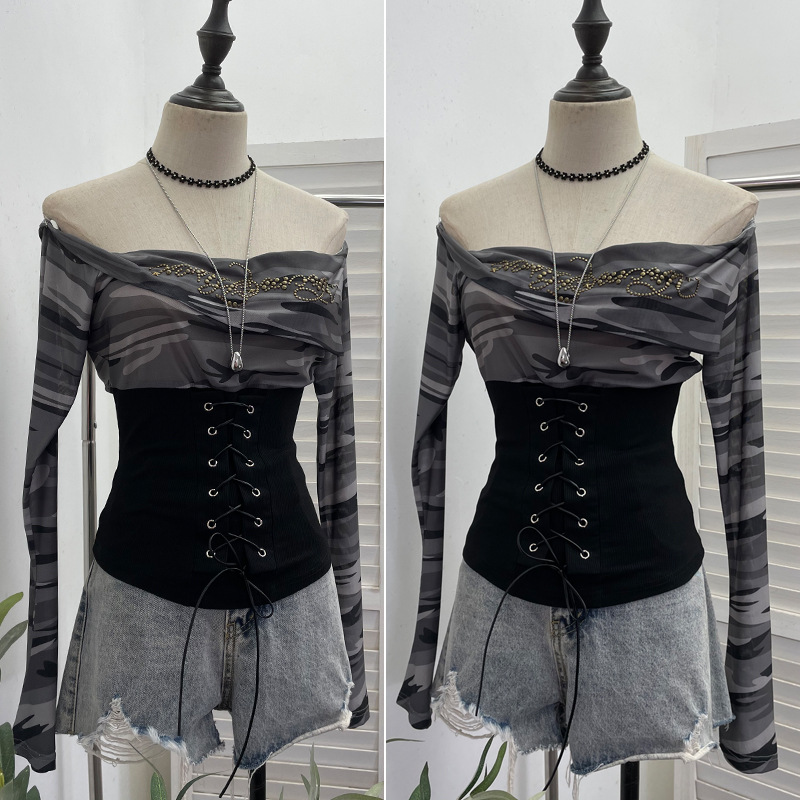 Nigikala Nigikala Real Shot Of The Hottie Shoulder Mesh Hot Diamond To Receive The Belt Strap Horn Long Sleeve Top Short T-Shirt 2760