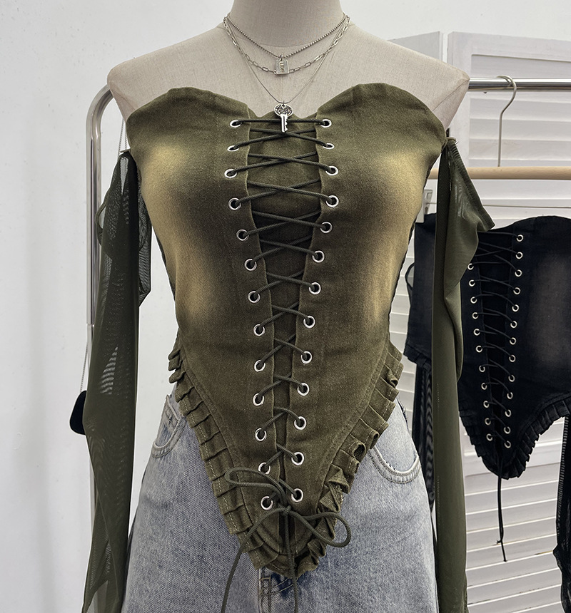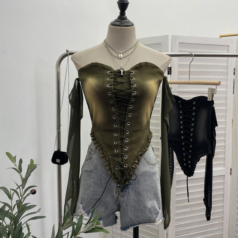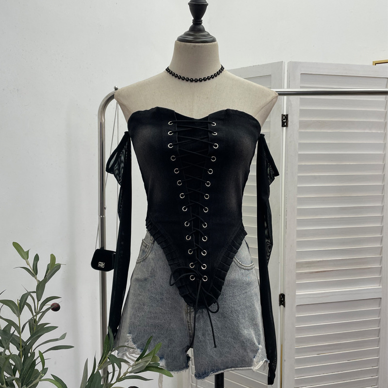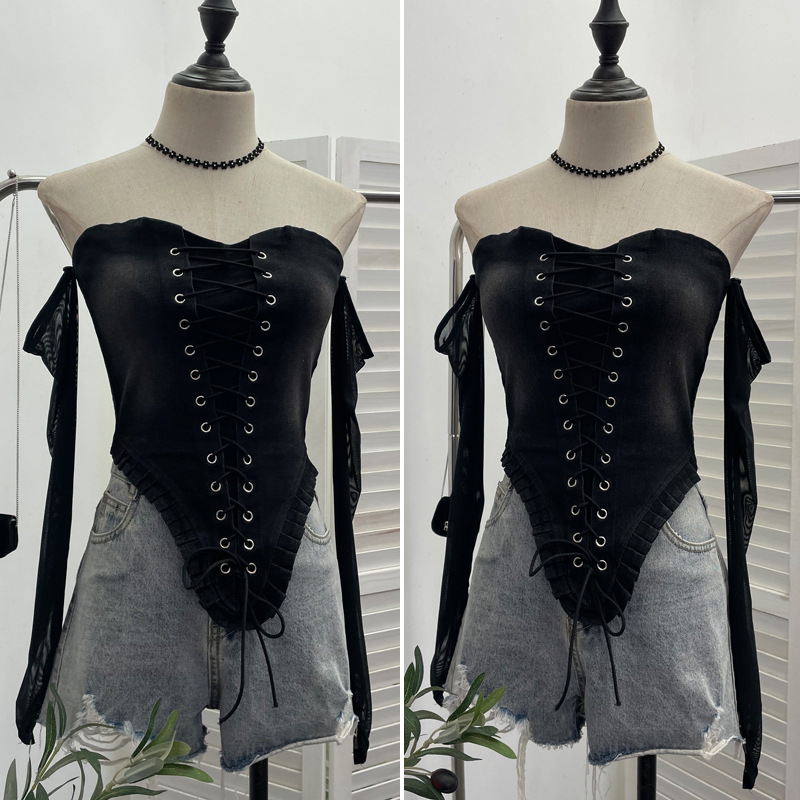 Nigikala Nigikala Sexy Tset Blouse Irregular Cowboy Splicing Mesh Yarn Tie With Short T-Shirt 6105