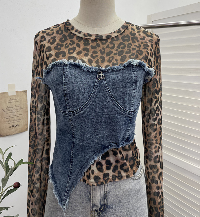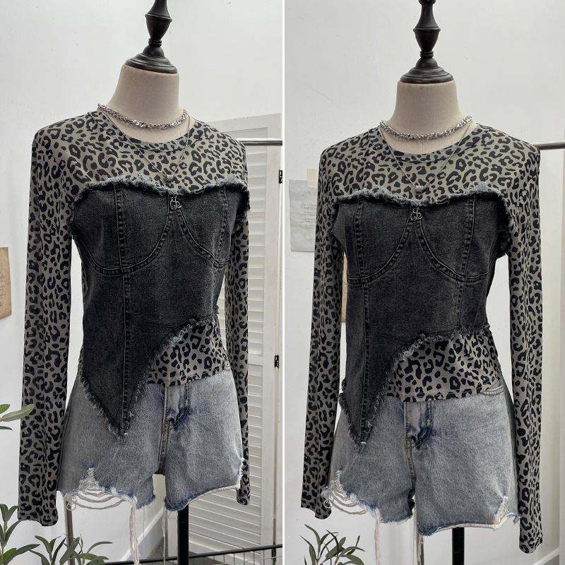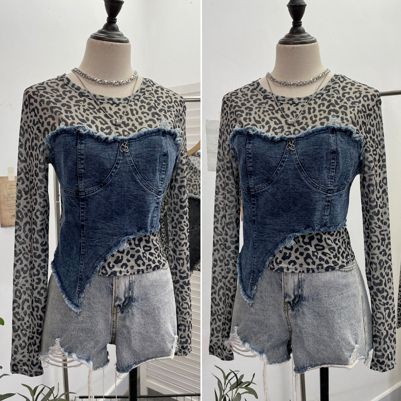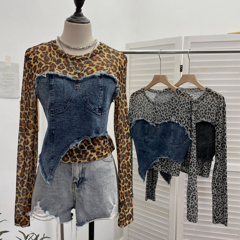 Nigikala Nigikala Shooting Fashion Leopard Tard Tard Babes Mesh Splicing Denim Irregular Bottom Shirt Short Top 2617
