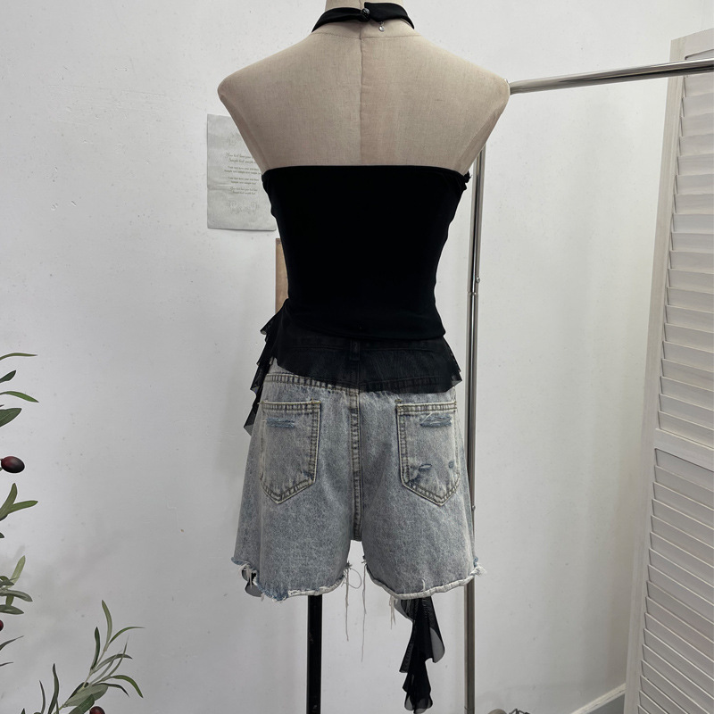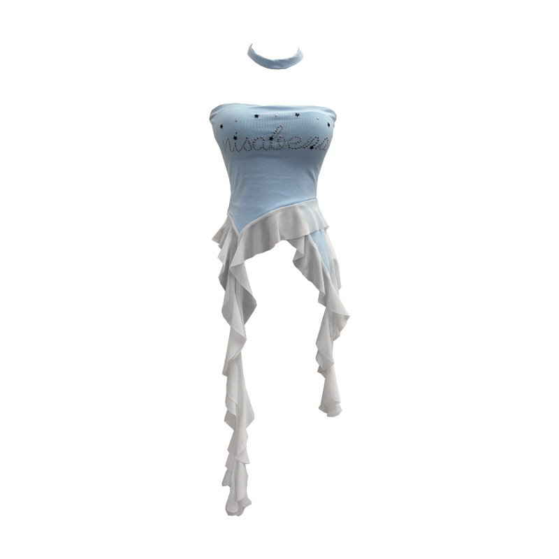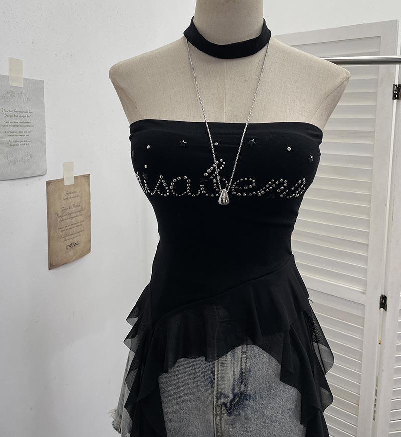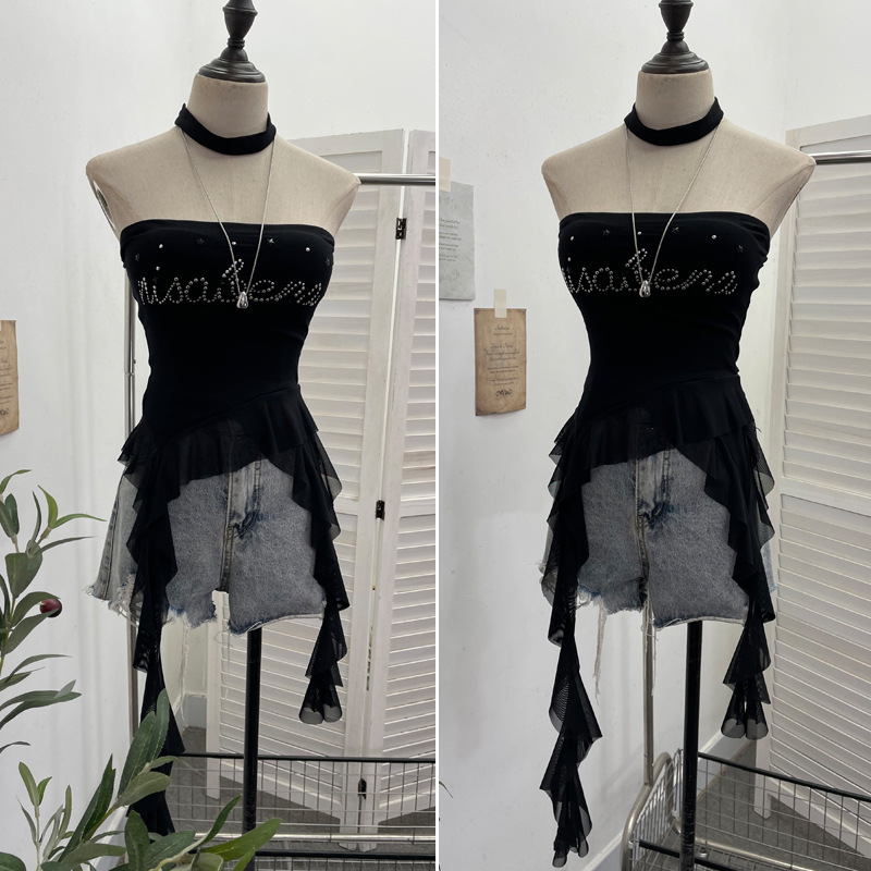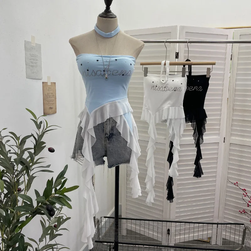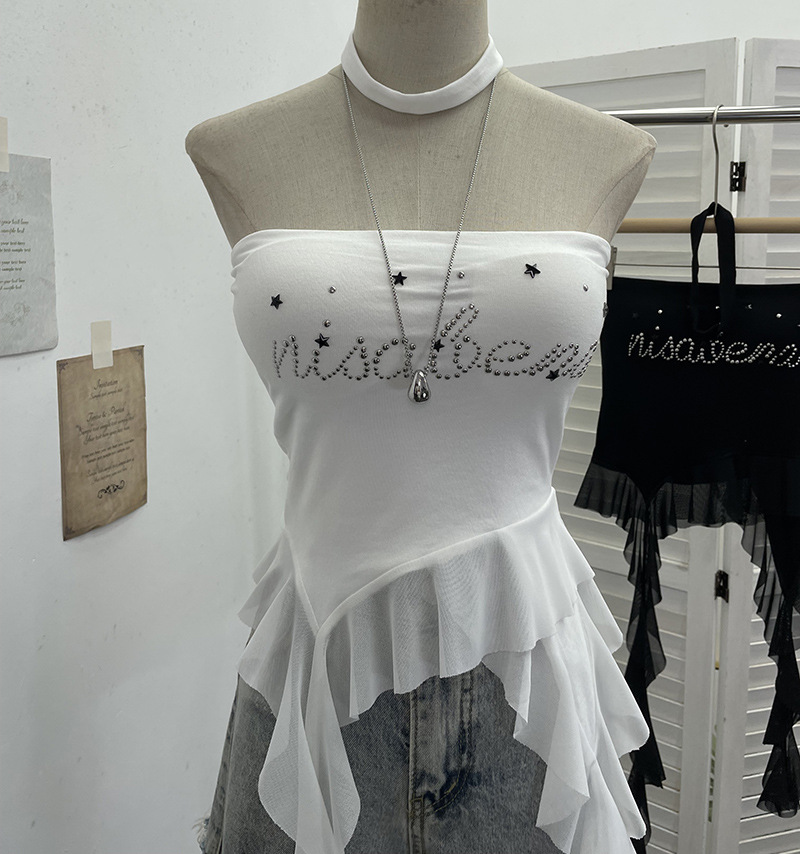 Nigikala Nigikala Shooting Hottie Letter Hot Diamond With Chest Pads To Wear Chest Vest Irregular Mesh Ribbon Hanging Neck Sleeveless Top 2729