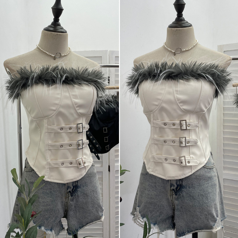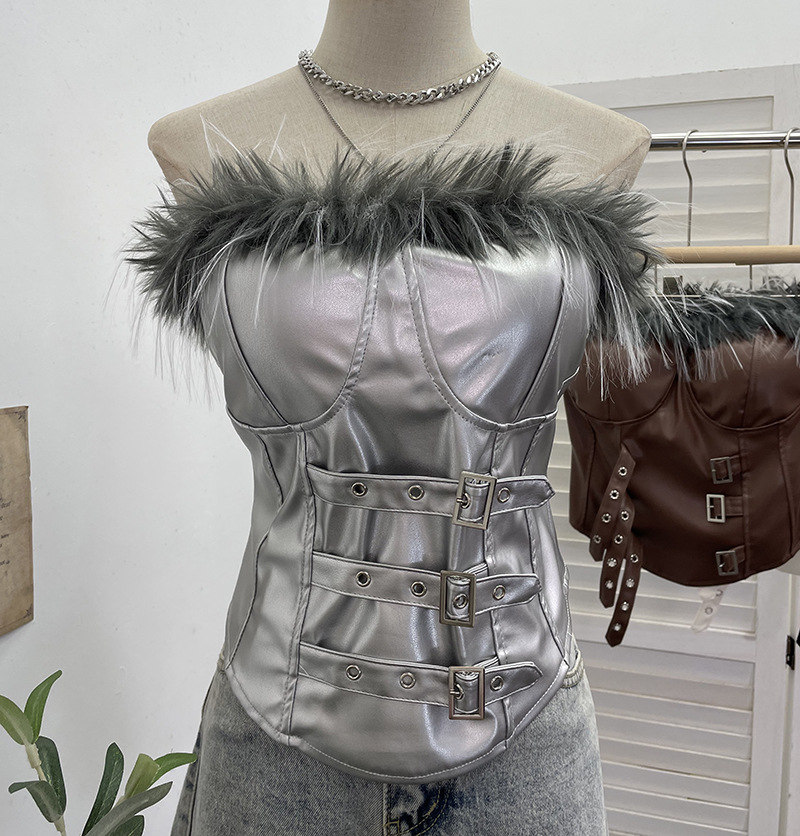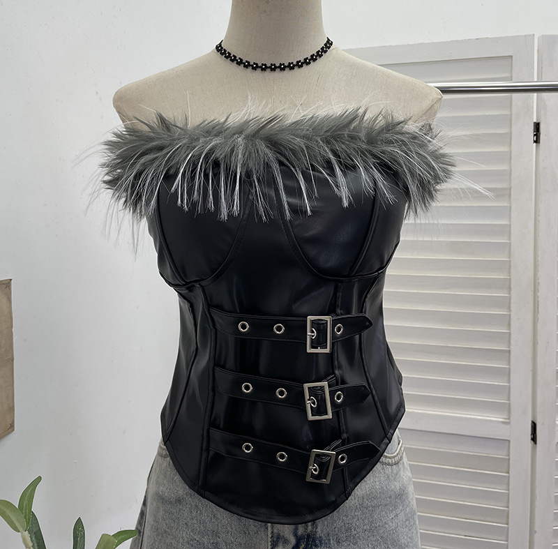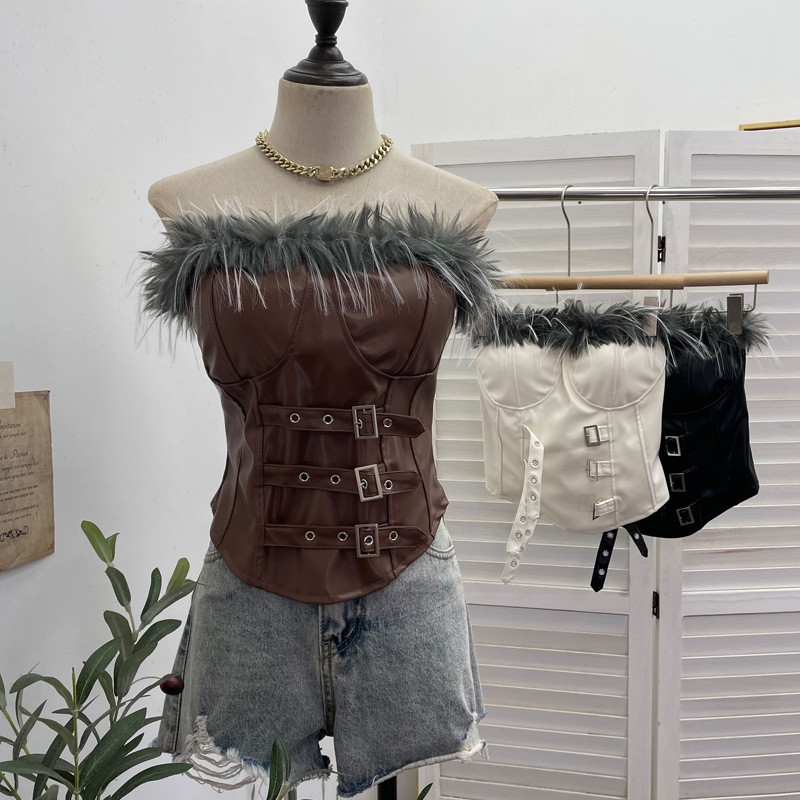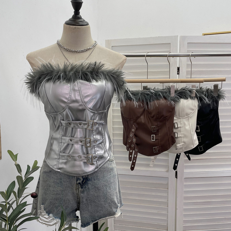 Nigikala Nigikala Shooting Retro Pu Skin Spliced Hair Bra Bra Strap Chest Punk Hottie Skin Buckle Waist Short Top 2781