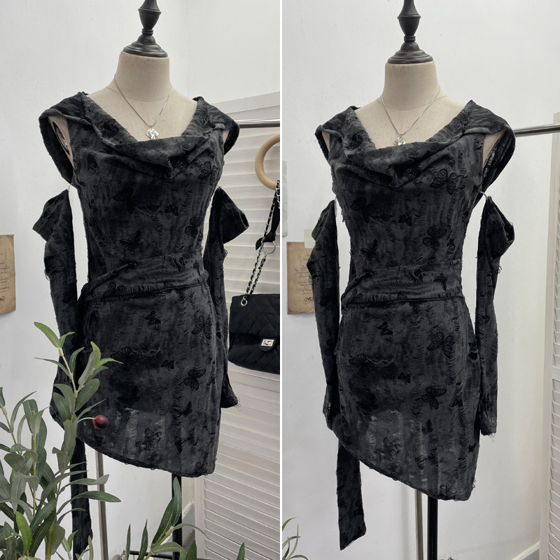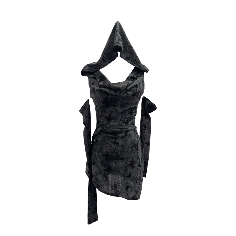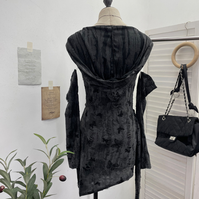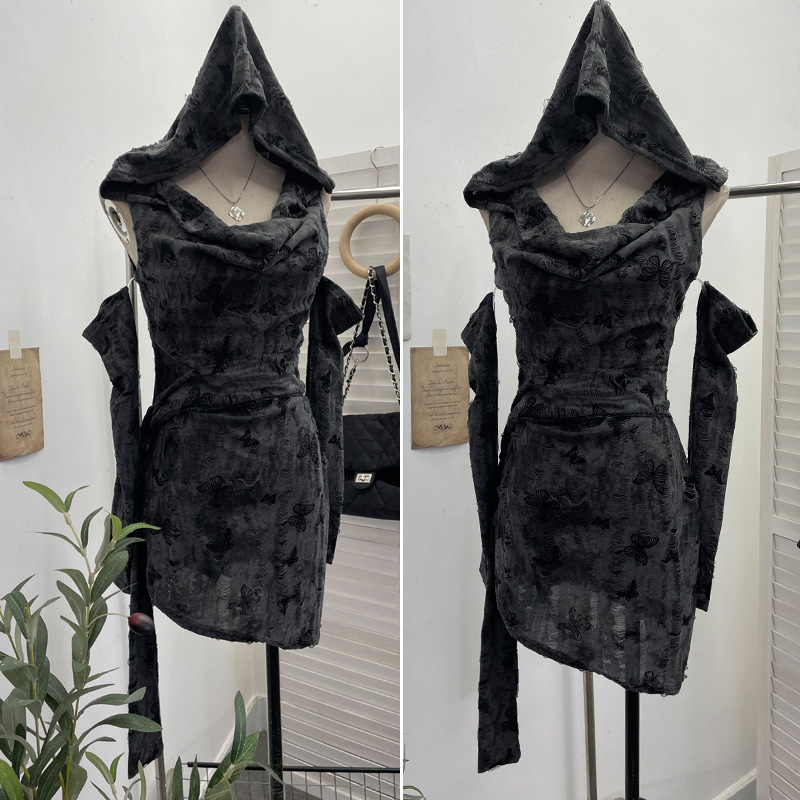 Nigikala Nigikala Shooting Wasteland Wind Makes Old Hole-Breaking Fabric Collared Hooded And Hip Dress With Cuff Cover Dress 9263