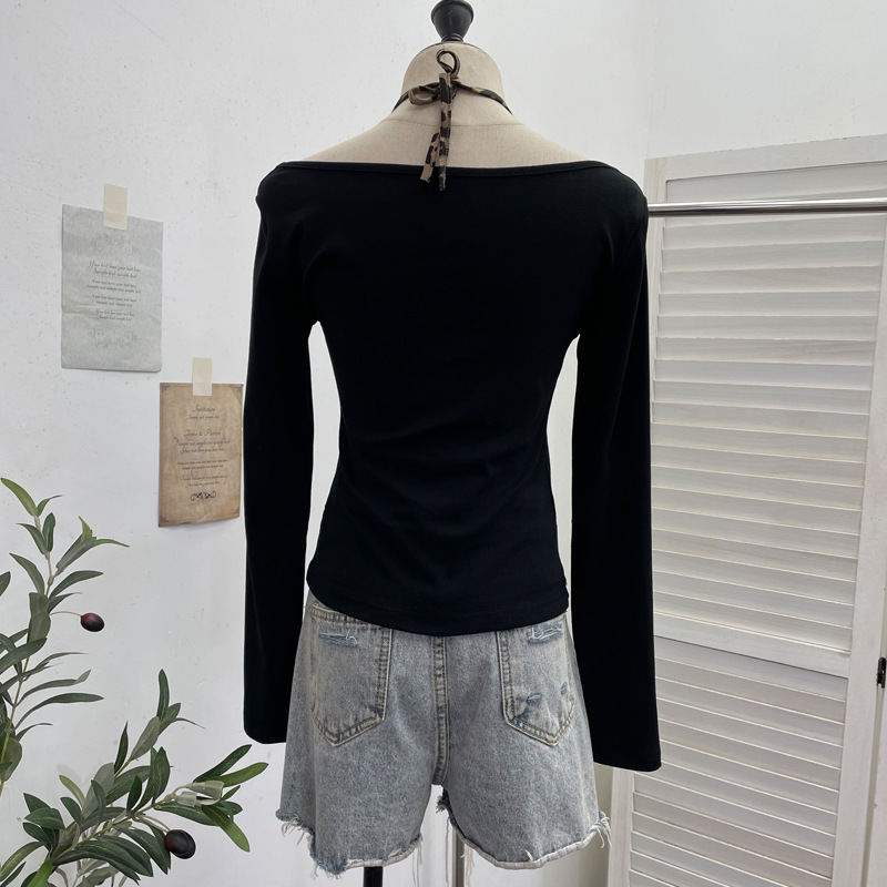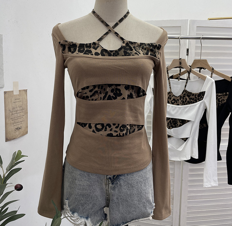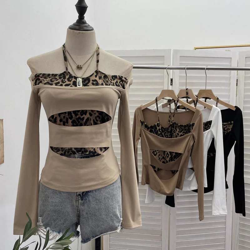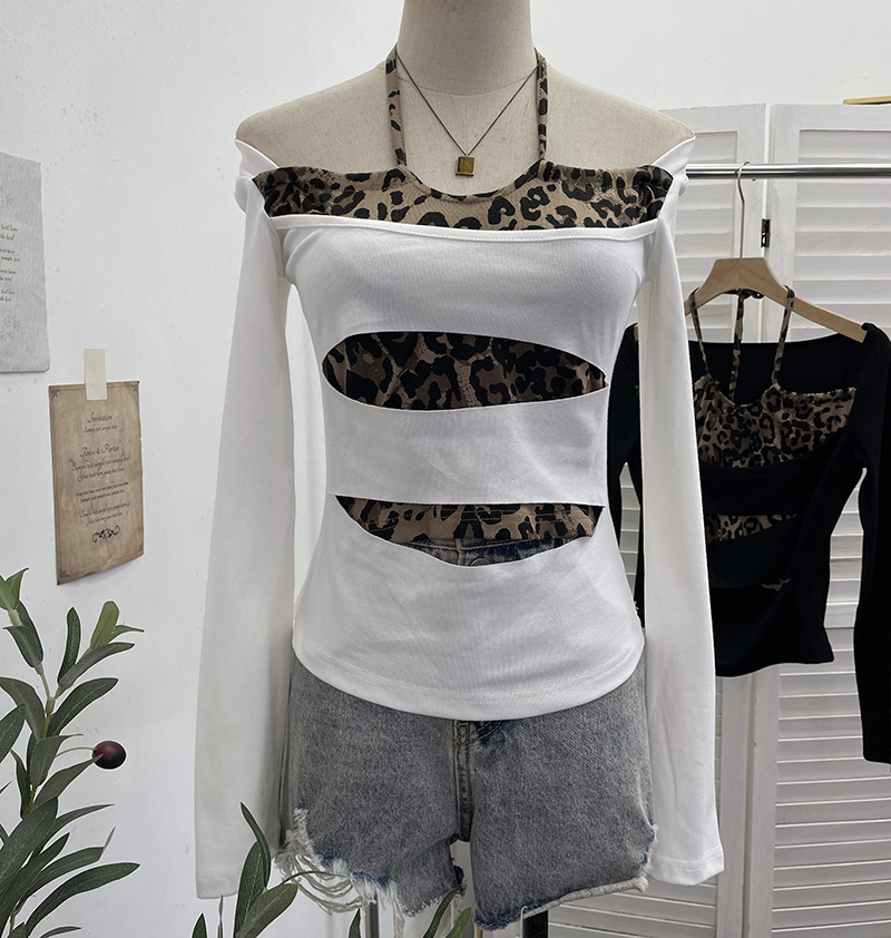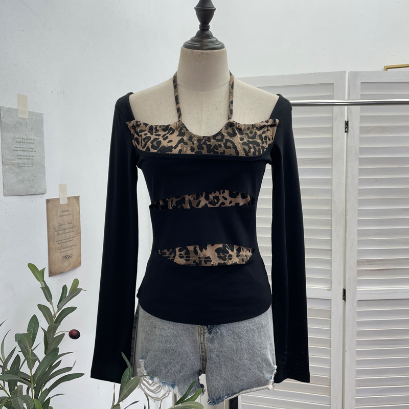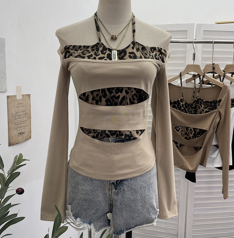 Nigikala Nigikala Shooting With Hanging Neck Leopard Print Splicing Two Long-Sleeved Tops A Short Shoulder Bottom T-Shirt 28787