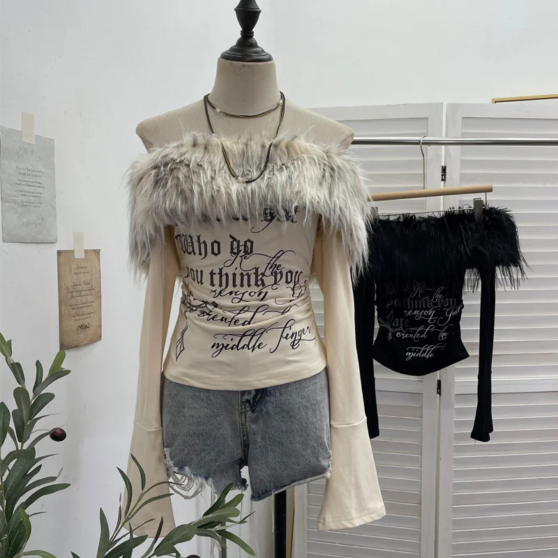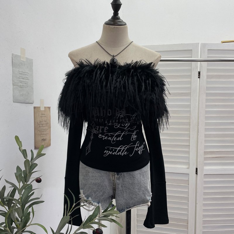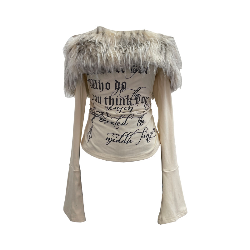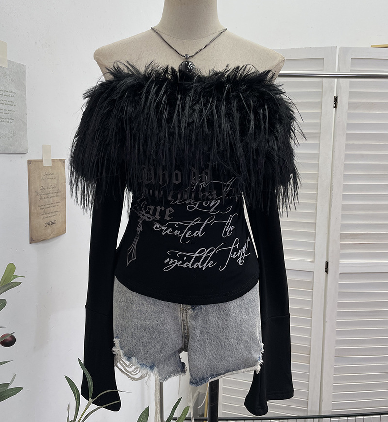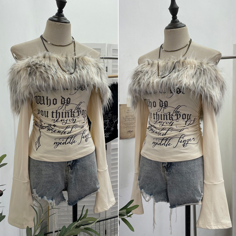 Nigikala Nigikala Shot Hair Collar Print Shoulder Horn Long-Sleeved T-Shirt Repair Short Picties Shoulder Grinding Top 1368