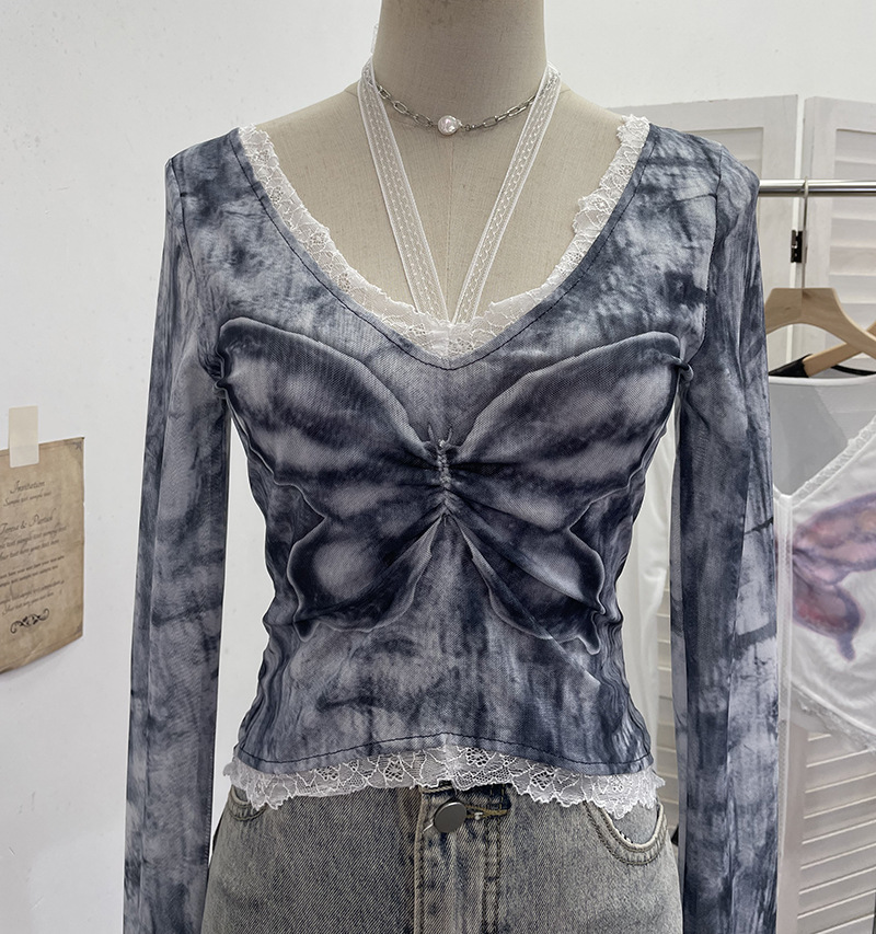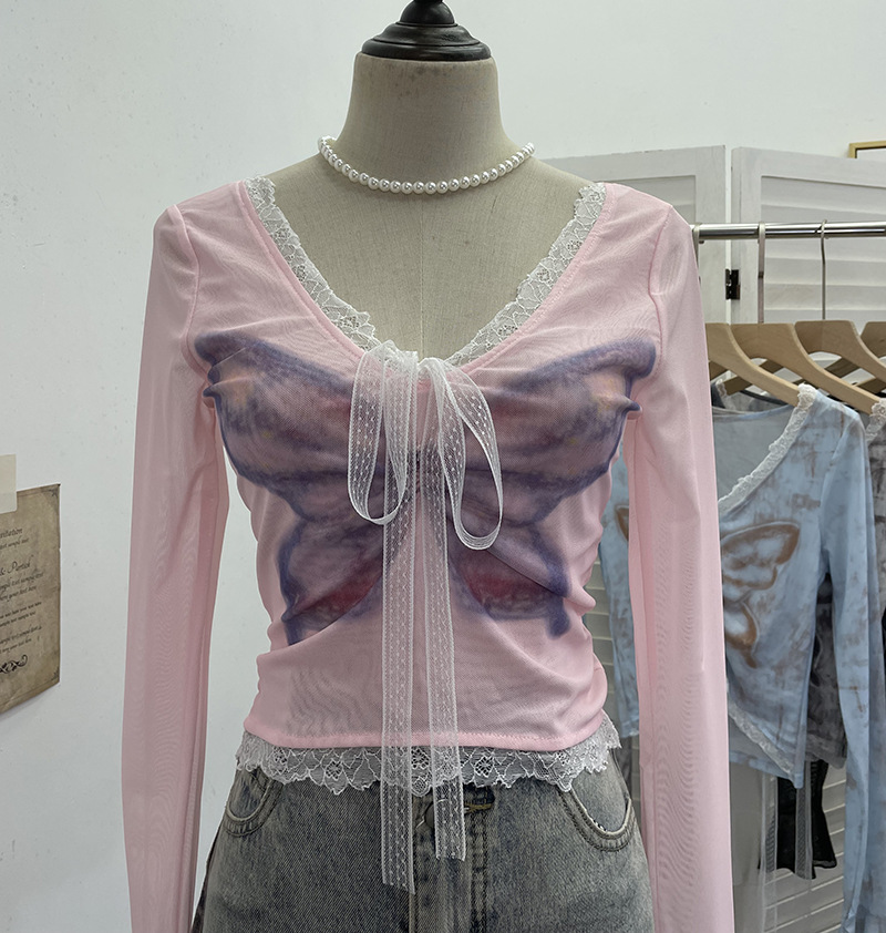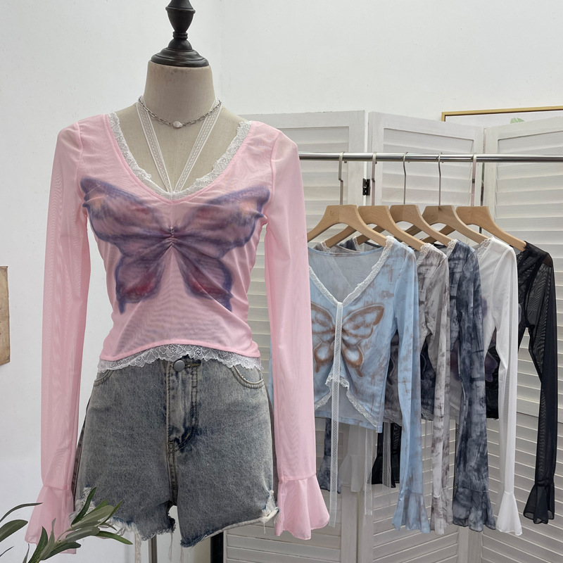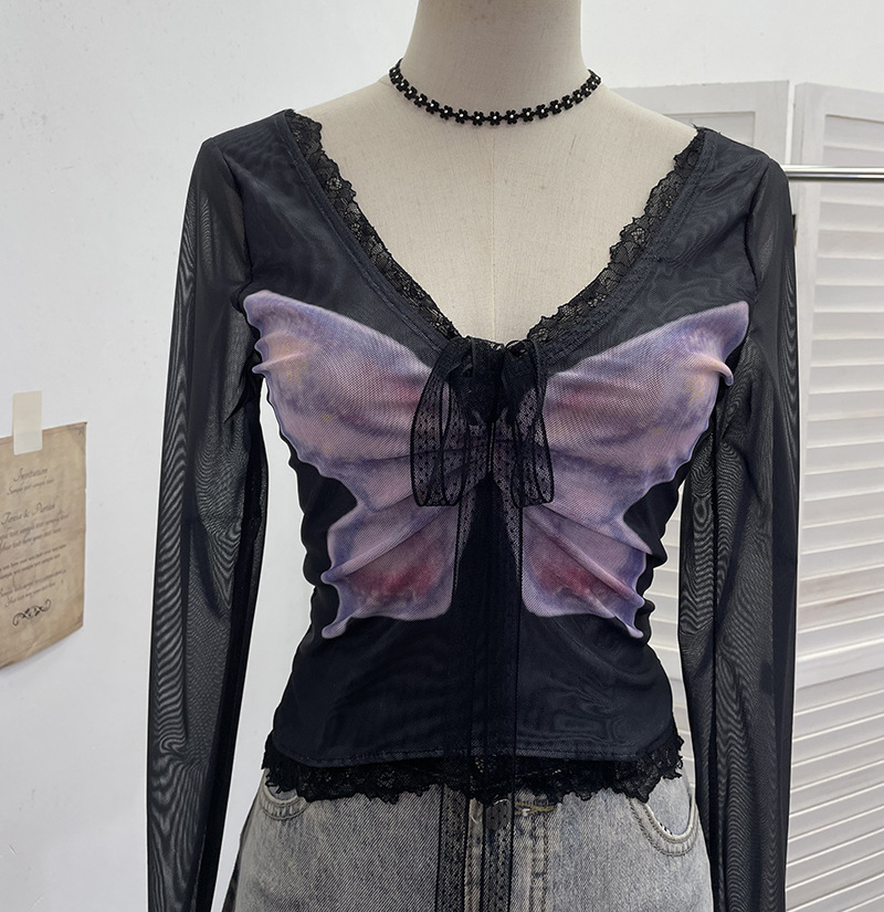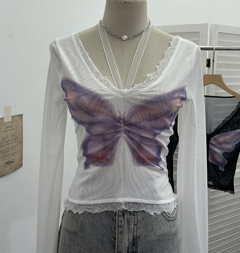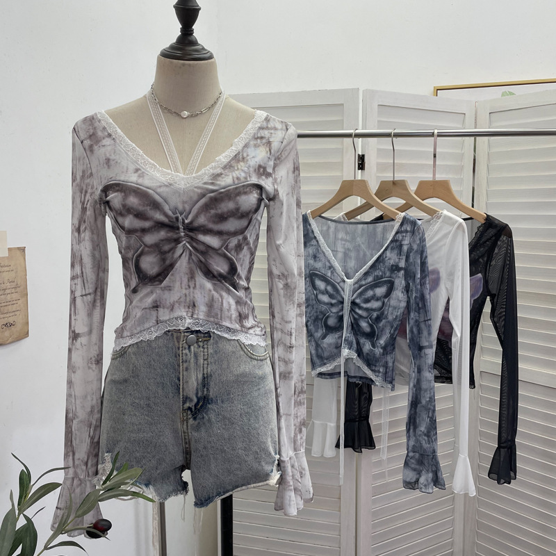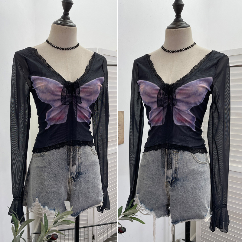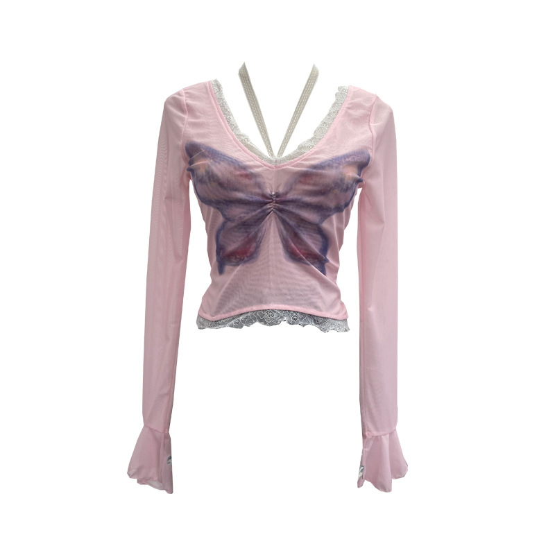 Nigikala Nigikala Shot Micro-Permeable Mesh Butterfly Print Splicing Lace Hanging Neck Horn Long-Sleeved T-Shirt Repair Short Top 1286