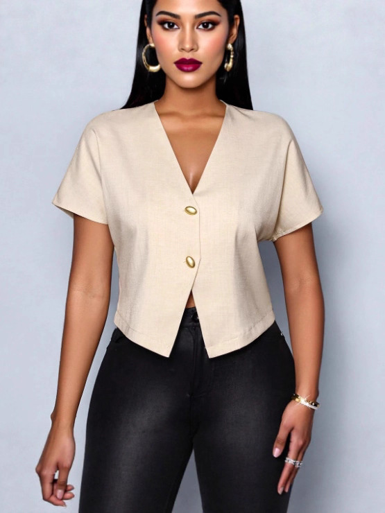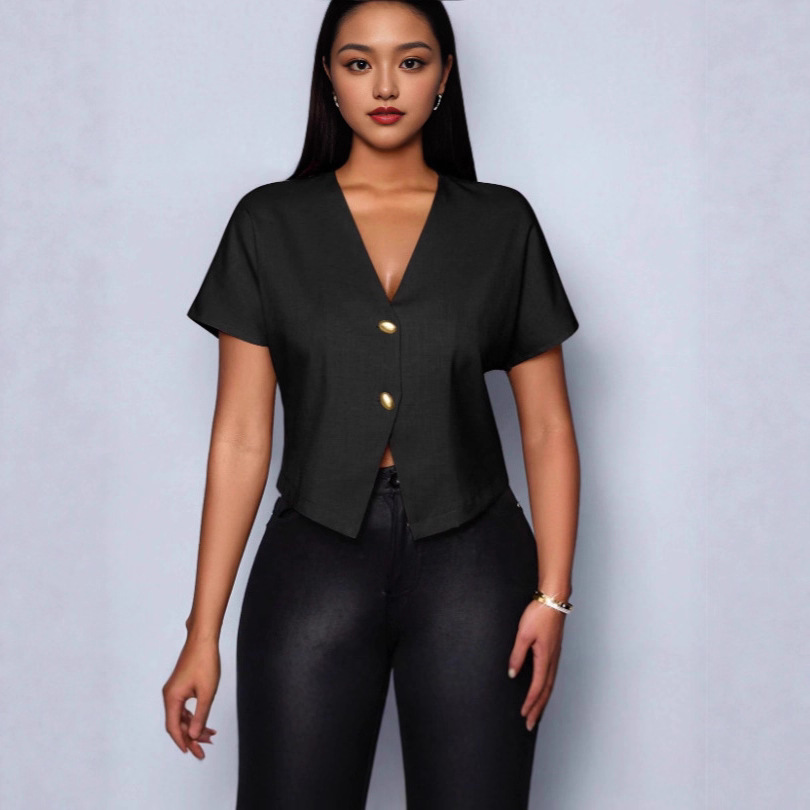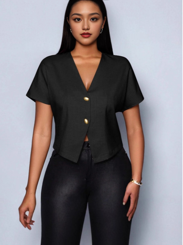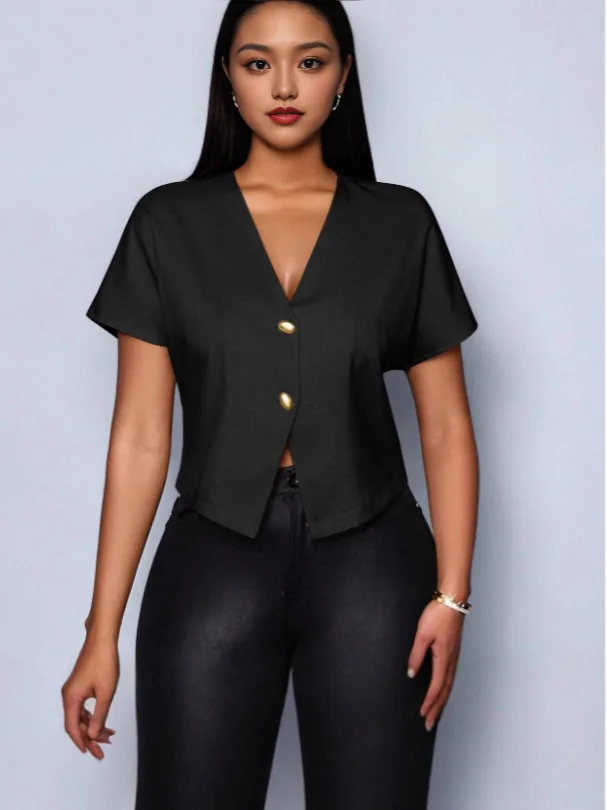 Nigikala Nigikala Solid Color V-Neck Metal Button Asymmetrical Sleeve Shirt