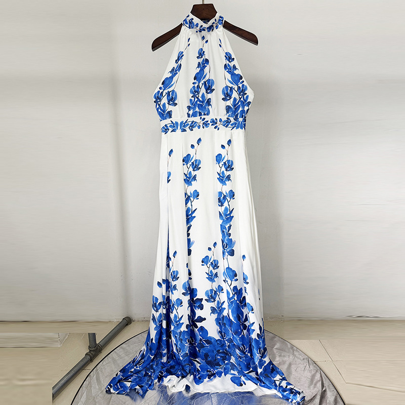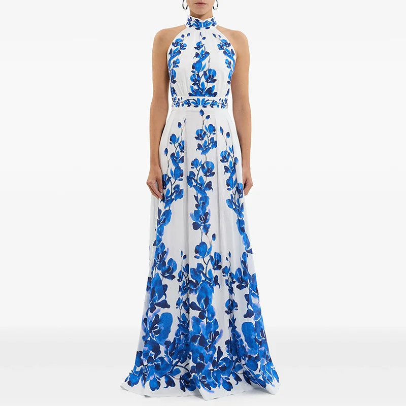 Nigikala Nigikala Spring And Summer New Star Fashion Printing Leisure Holiday Dress Hanging Neck Long Dress