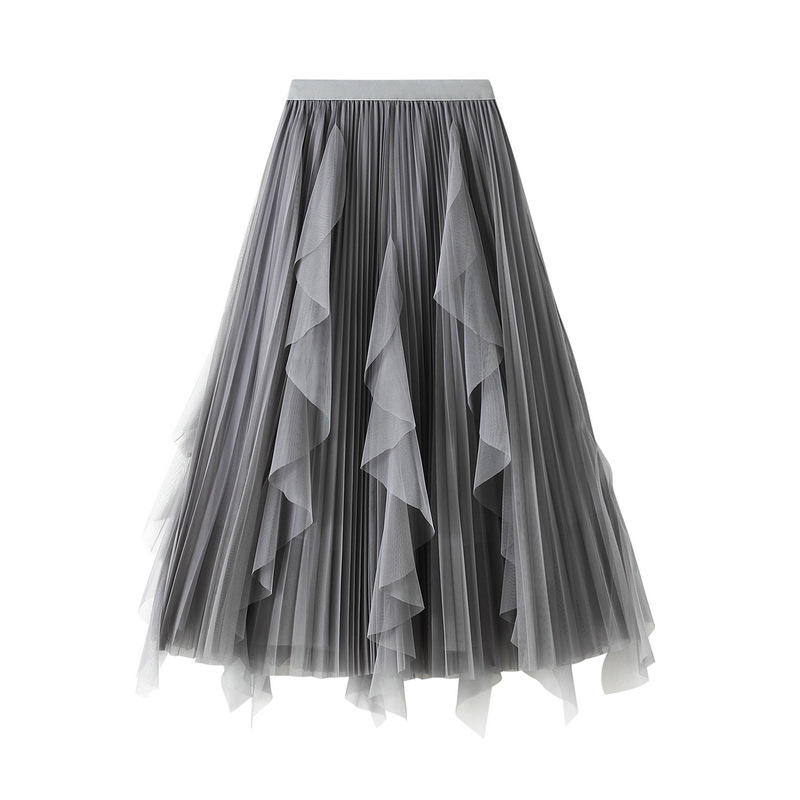 Nigikala Nigikala Spring New High-Waisted Lotus Leaf Side Splicing Mesh Dress Half-Dress Woman's Long-Term Large Folding Skirt 0889