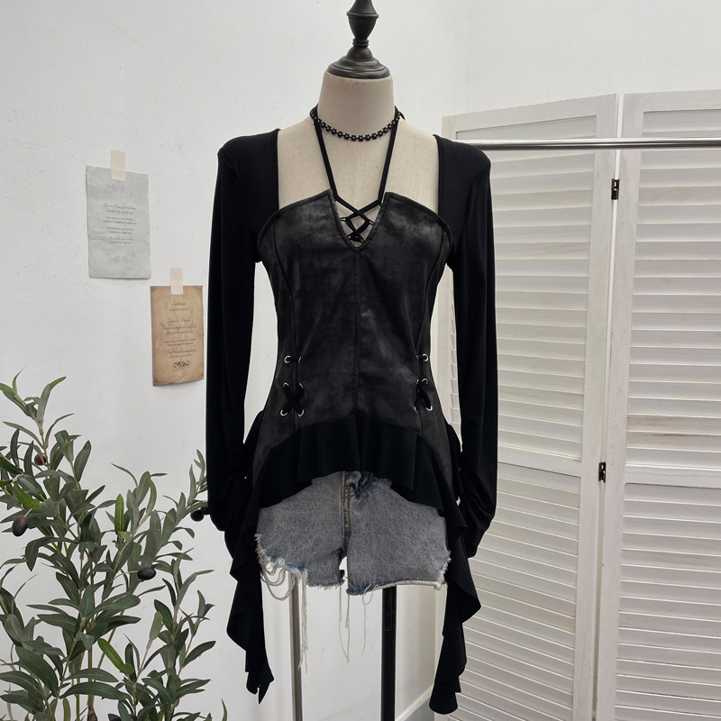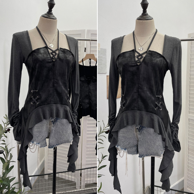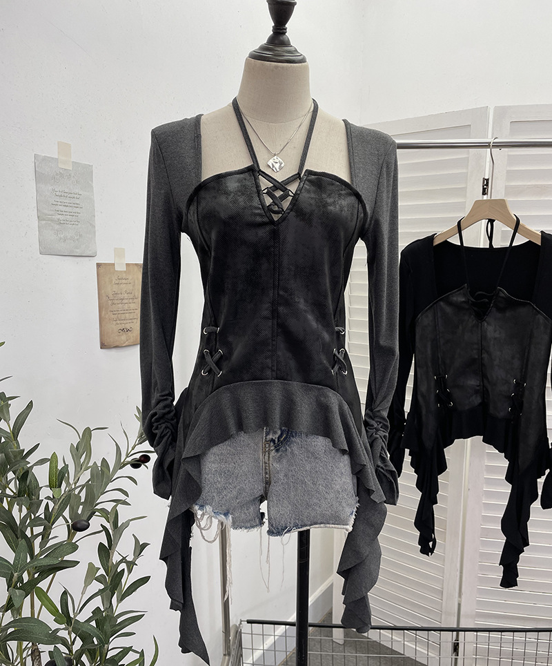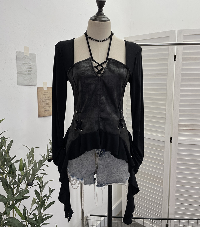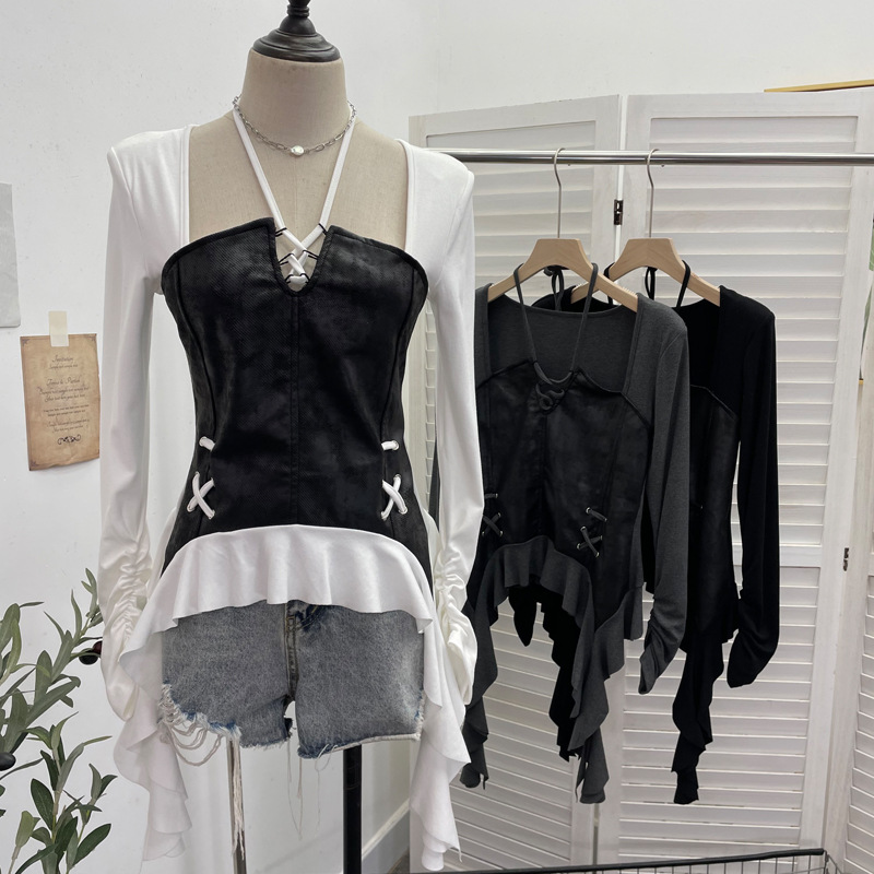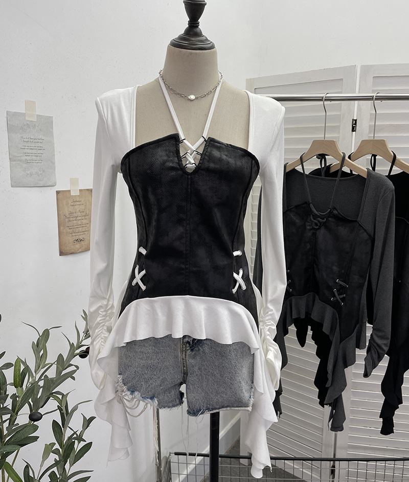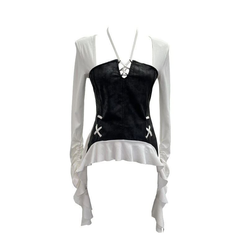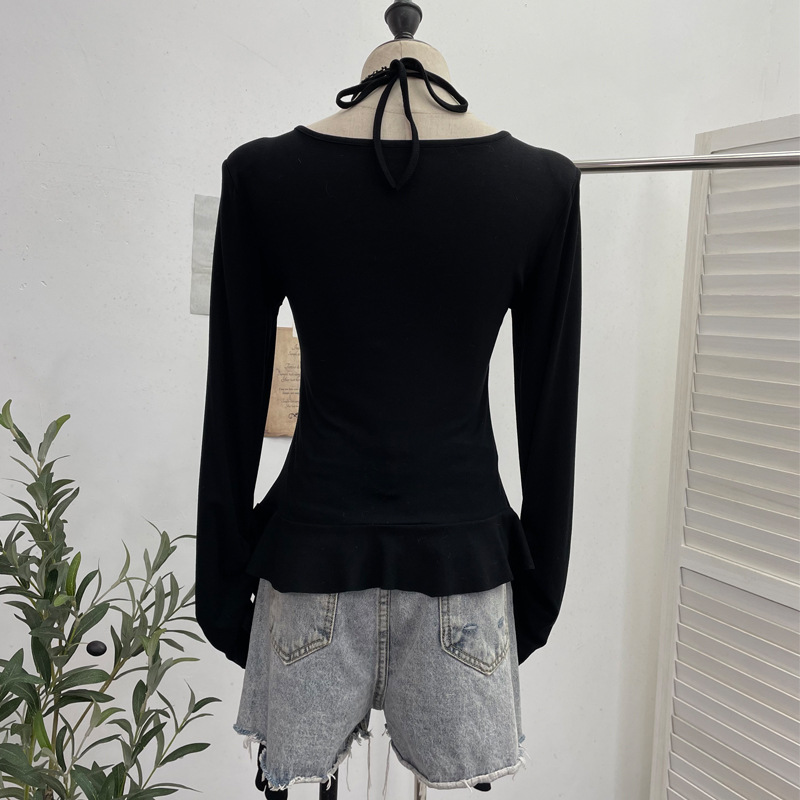 Nigikala Nigikala Tidal Irregular Hanging Neck Tie With Hollow Spliced Niche Pads On The Shoulder With Long-Sleeved T-Shirt 2695