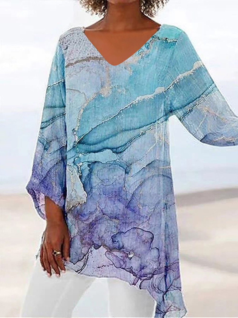 Nigikala Nigikala Women's Clothing 2025 Summer New T-Shirt Casual Loose Irregular Print Long-Sleeved V-Neck Top