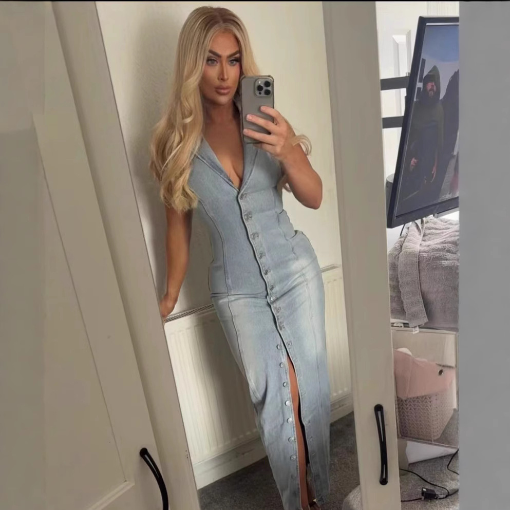 Nigikala Nigikala Women's Explosive Temperament Light Blue Sexy Cardigan Cowboy Button Dress