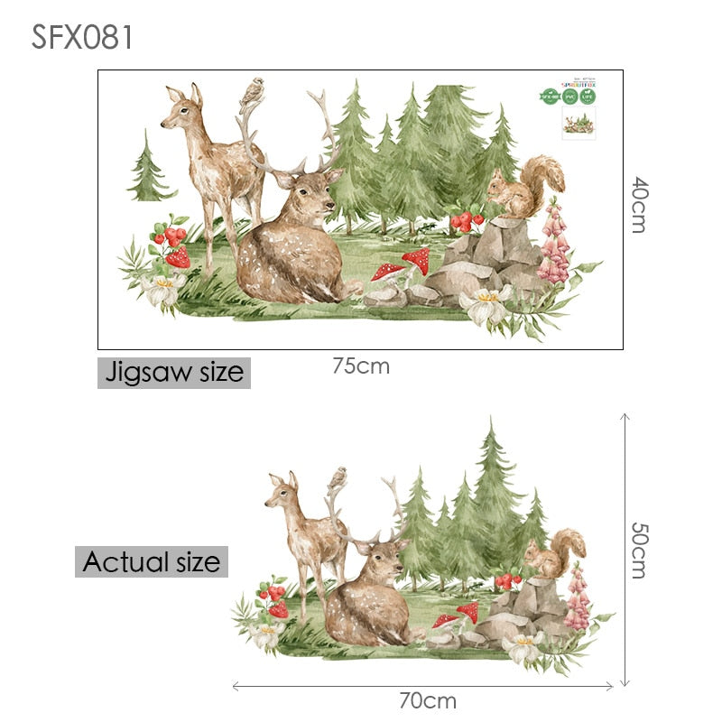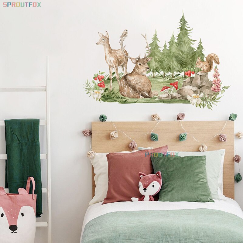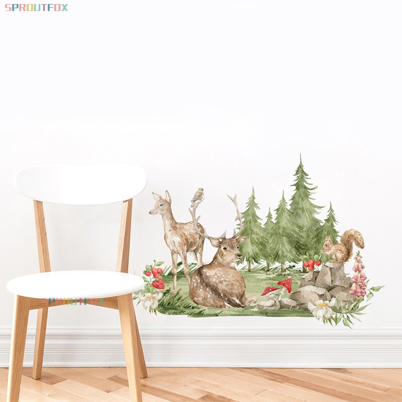 Nordic Cartoon Deer Wall Sticker Tree Green Forest Animal Wall Decals for Baby Room Living Room Decoration Kids Stickers