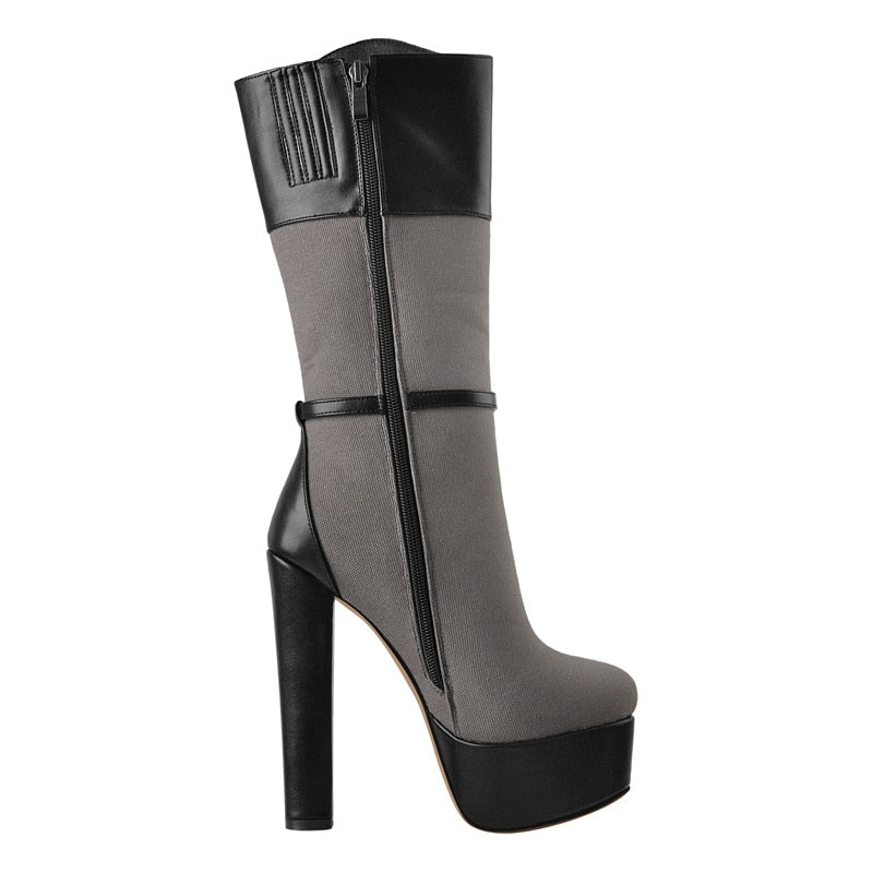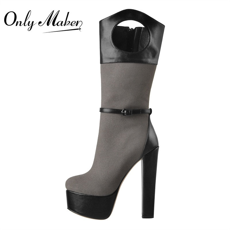 Onlymaker Winter Mid-Calf Boots Matte Black PU Patchwork Mesh Round Heels Platform Shoes Cutout Comfortable Zipper 2021