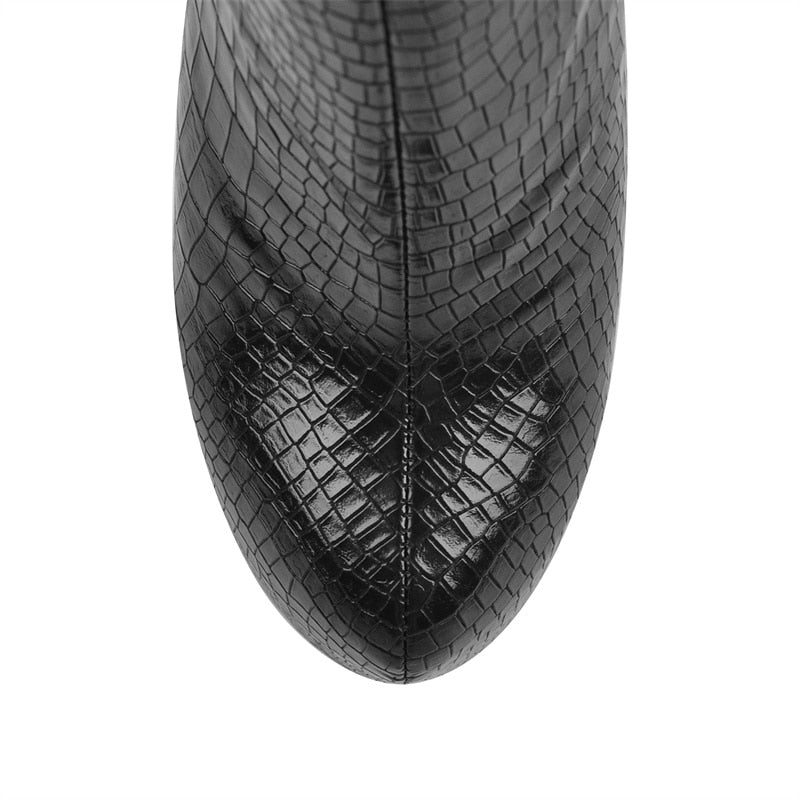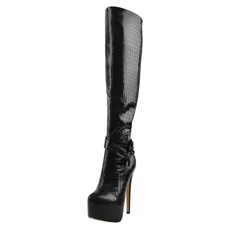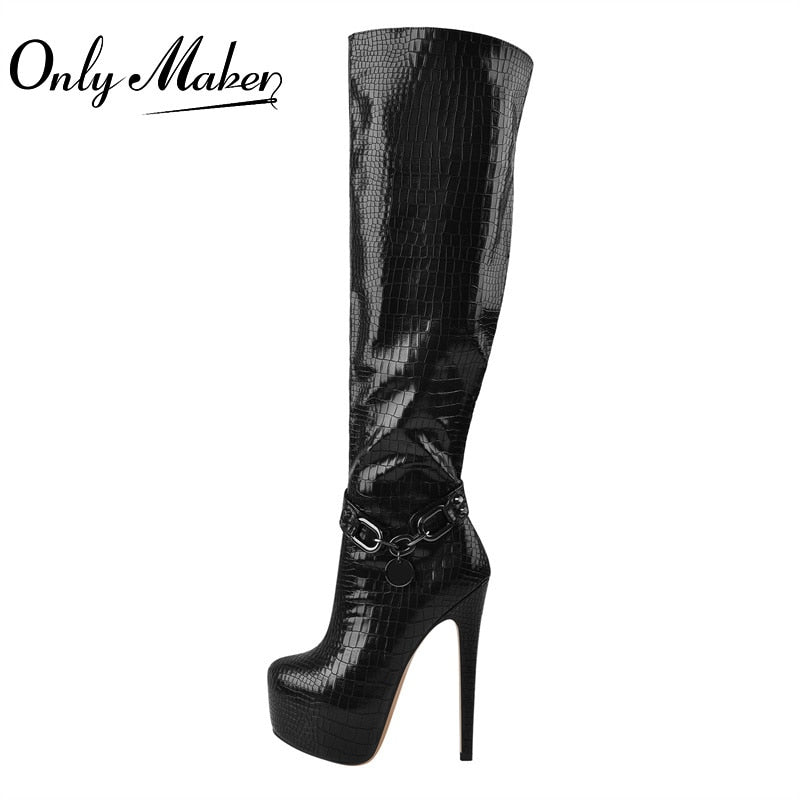 Onlymaker Winter Thigh High Heel Over The Knee Boots Lady Black PU Patent Leather Crocodile Print Metal Chain Decoration Zipper