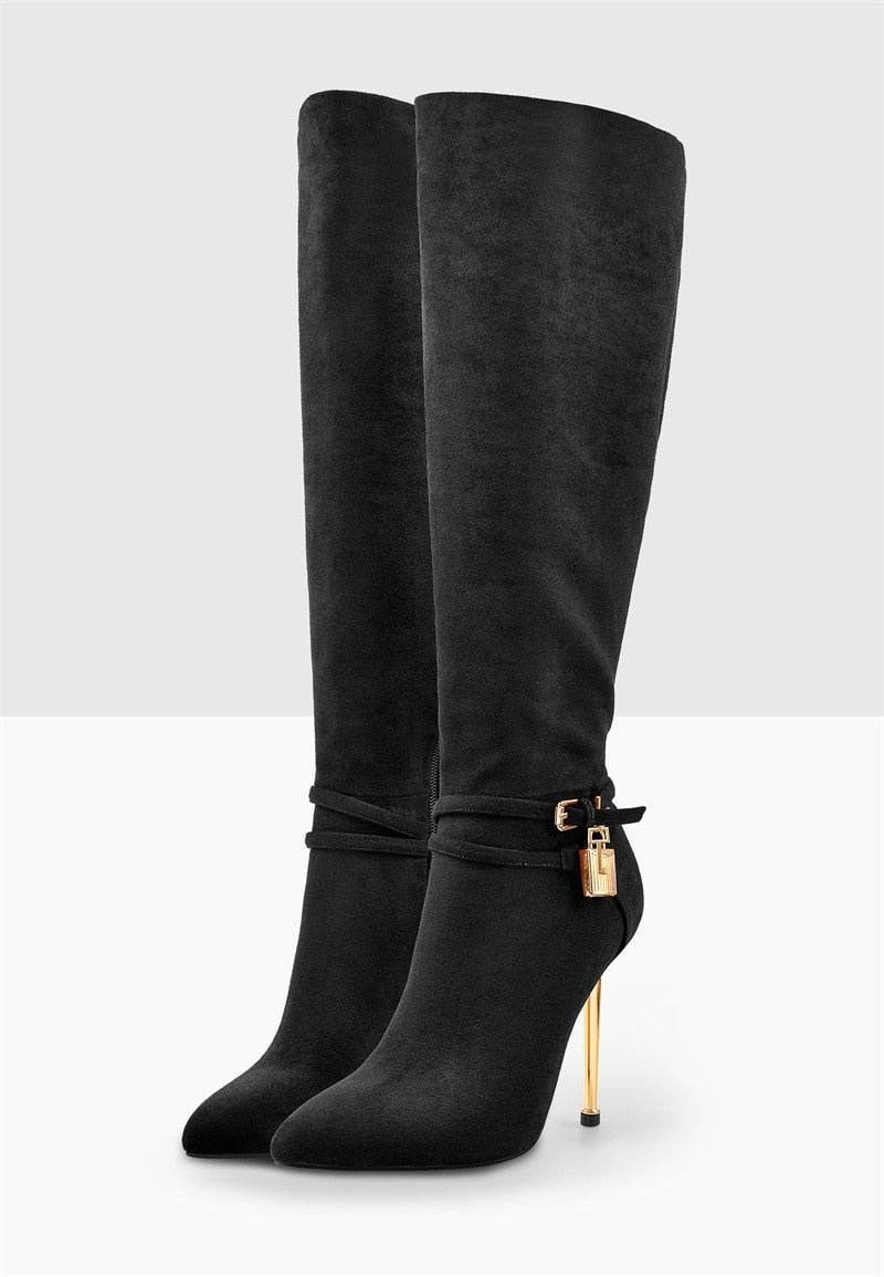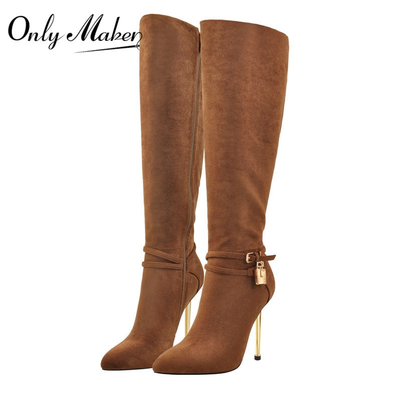Onlymaker Women's Pointed Toe Brown Suede Lock decoration Side Zip Knee High Boots Side Zip Stiletto Metal heel Long Boots