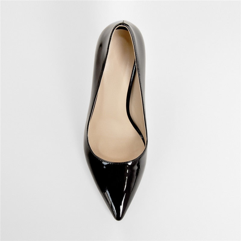 Onlymaker Women's Shoes Pointed Toe Black Red Patent Leather Metal Heels Fashion Dress Wedding Party Big Size Lady Thin Pumps