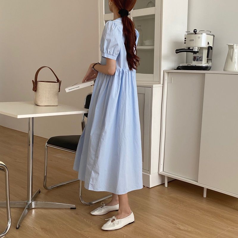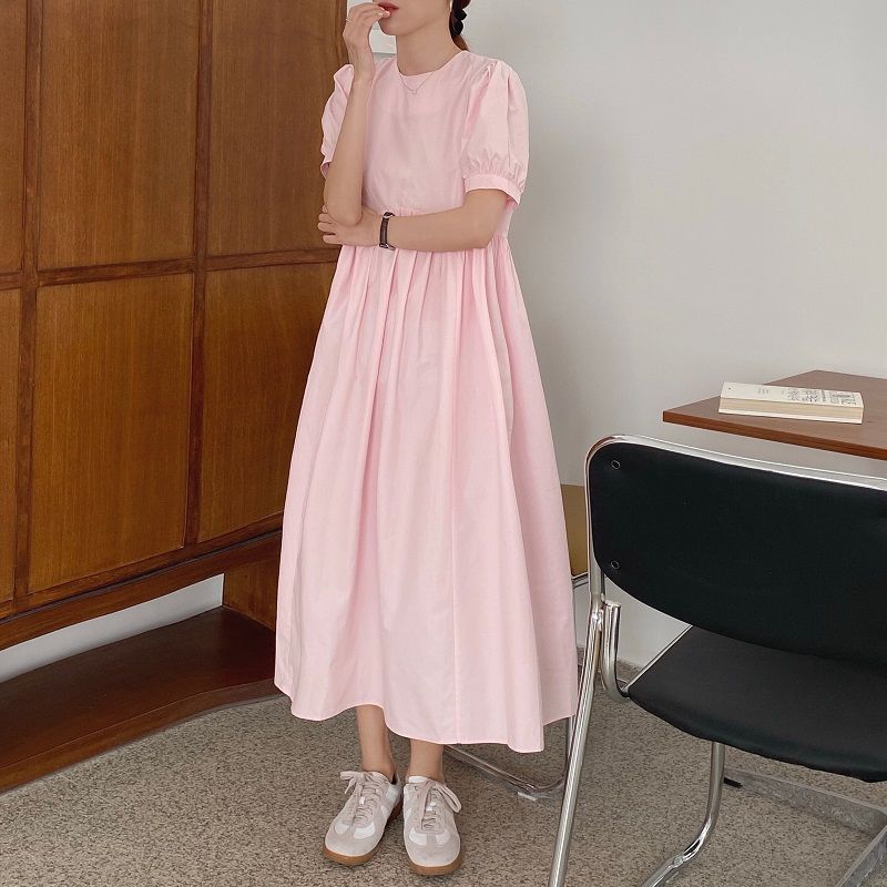Short Sleeve Dress Women Solid Pink Basic Classic Simple Summer All-match Female Loose Korean Kawaii Sweet Vintage Chic
