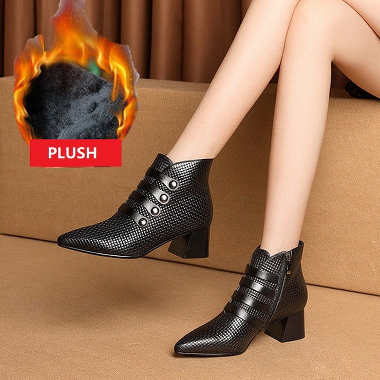 Soft Leather Short Boots Woman Mid Heels Ankle Boot Women Winter Plush Shoes 2020 Square heel Pointed toe Female Footware Black