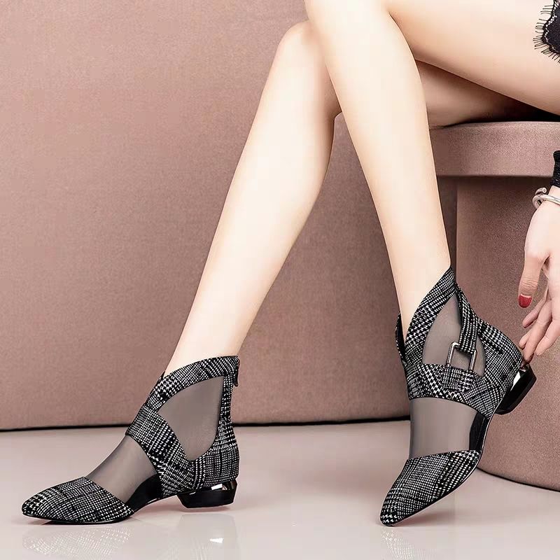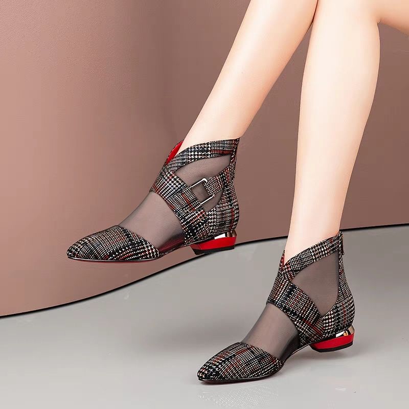 Spring New Single Shoes Women Low Heels Woman Ponited toe Mesh Shoes Buckle Side Hollow out Lattice Pattern Black Red